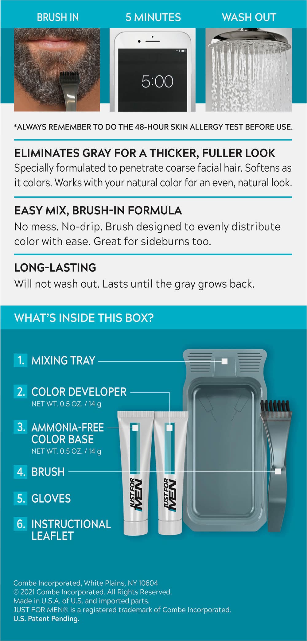 Multiple application haircolor kit. Eliminates gray for a thicker fuller look. 3 Easy steps (Always remember to do the 48-hour skin allergy test before use). Mix. Brush. Wash. Works on even the coarsest facial hair. Won't wash out. Lasts until gray grows back. Eliminates Gray for a Thicker, Fuller Look: Specially formulated to penetrate coarse facial hair. Softens as it colors. Works with your natural color for an even, natural look. Easy Mix, Brush-in Formula: No mess. No-drip. Brush designed to evenly distribute color with ease. Great for sideburns too. Long Lasting: Will not wash out. Lasts until the gray grows back. 1. Mixing tray. 2. Color developer. 4. Brush. 5. Gloves. 6. Instructional leaflet • Color: Light brown • Packaging: Reusable