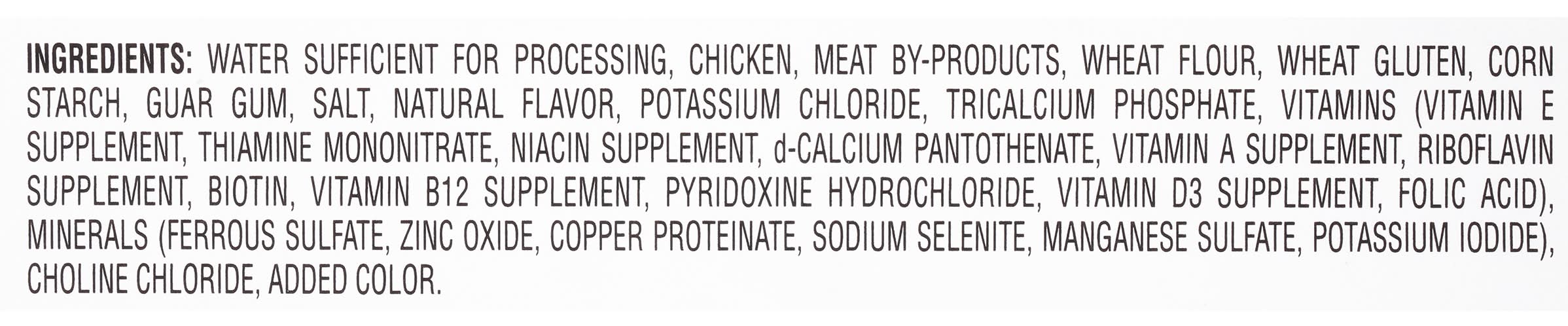 Ingredients: WATER SUFFICIENT FOR PROCESSING, CHICKEN, MEAT BY-PRODUCTS, WHEAT FLOUR, WHEAT GLUTEN, CORN STARCH, GUAR GUM, SALT, NATURAL FLAVOR, POTASSIUM CHLORIDE, TRICALCIUM PHOSPHATE, VITAMINS (VITAMIN E SUPPLEMENT, THIAMINE MONONITRATE, NIACIN SUPPLEMENT, D-CALCIUM PANTOTHENATE, VITAMIN A SUPPLEMENT, RIBOFLAVIN SUPPLEMENT, BIOTIN, VITAMIN B12 SUPPLEMENT, PYRIDOXINE HYDROCHLORIDE, VITAMIN D3 SUPPLEMENT, FOLIC ACID), MINERALS (FERROUS SULFATE, ZINC OXIDE, COPPER PROTEINATE, SODIUM SELENITE, MANGANESE SULFATE, POTASSIUM IODIDE), CHOLINE CHLORIDE, ADDED COLOR