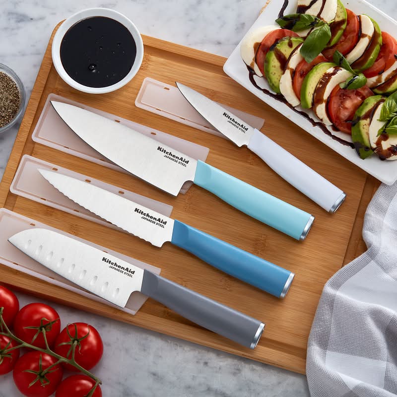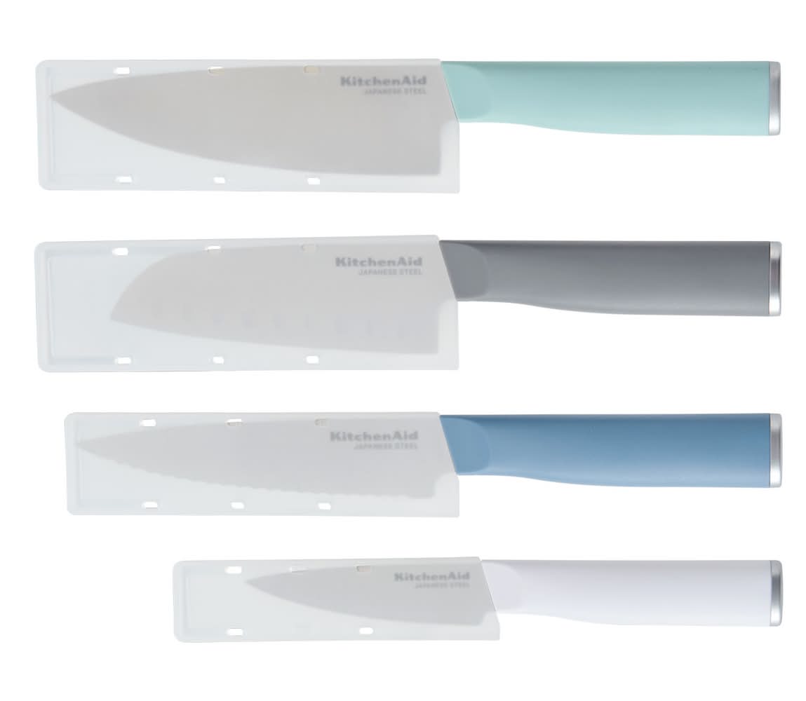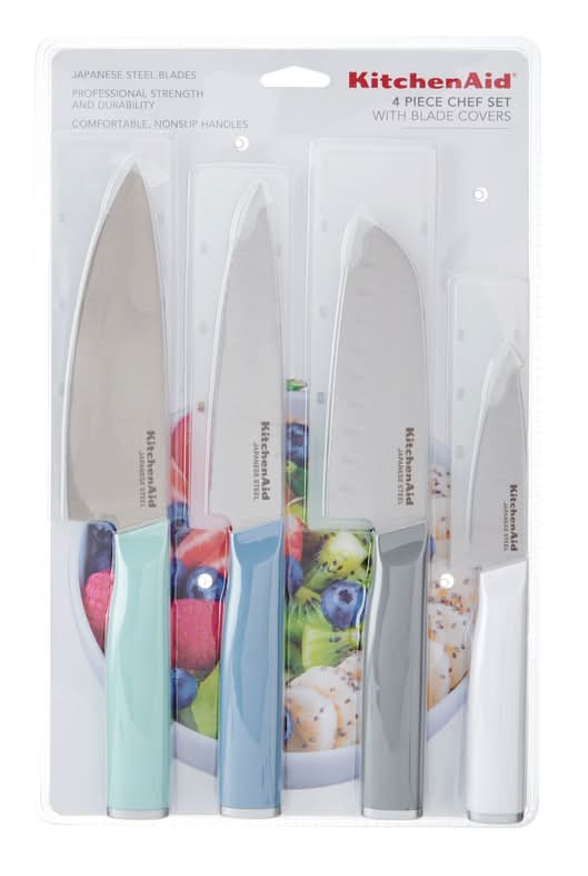 This KitchenAid® Classic 4-piece chef set includes all the essential cutlery needed to perform everyday food prep tasks such as slicing, cutting, chopping, mincing, trimming, and more. Use the 8-inch chef knife to chop, the 5.5-inch serrated utility knife to cut through delicate crust, the 5-inch santoku to chop and dice, and the 3.5-inch paring knife to peel, trim and garnish small fruits and vegetables. Blades are expertly crafted from semi-polished, high-carbon Japanese steel, hardened and tempered to provide a long-lasting edge for a professional, quality cut every time. These KitchenAid knives feature Eastern-style ergonomic handles that provide optimal control for everyday use. They are expertly engineered with a textured finish for a comfortable grip and accented with a chrome endcap. Includes custom-fit blade covers for secure, safe storage. KitchenAid knives are top-rack dishwasher safe. To extend the life of your cutlery, hand washing is recommended. Dry immediately.