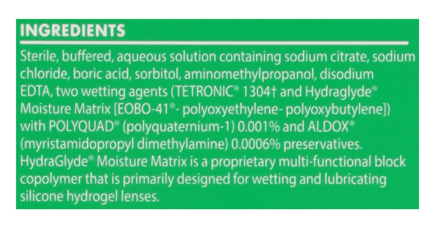 Ingredients: Sterile, Buffered, Aqueous Solution Containing Sodium Citrate, Sodium Chloride, Boric Acid, Sorbitol, Aminomethylpropanol, Disodium EDTA, Two Wetting Agents Tetronic 1304 and Hydraglyde Moisture Matrix [Eobo-41 Polyoxyethylene-Polyoxybutylen] with Polyquad Polyquaternium-1 0, 001% and Aldox Myristamidopropyl Dimethylamine 0, 0006% Preservatives, Hydraglyde Moisture Matrix is a Proprietary Multi-Functional Block Copolymer That is Primarily Designed for Wetting and Lubricating Silicone Hydrogel Lenses.