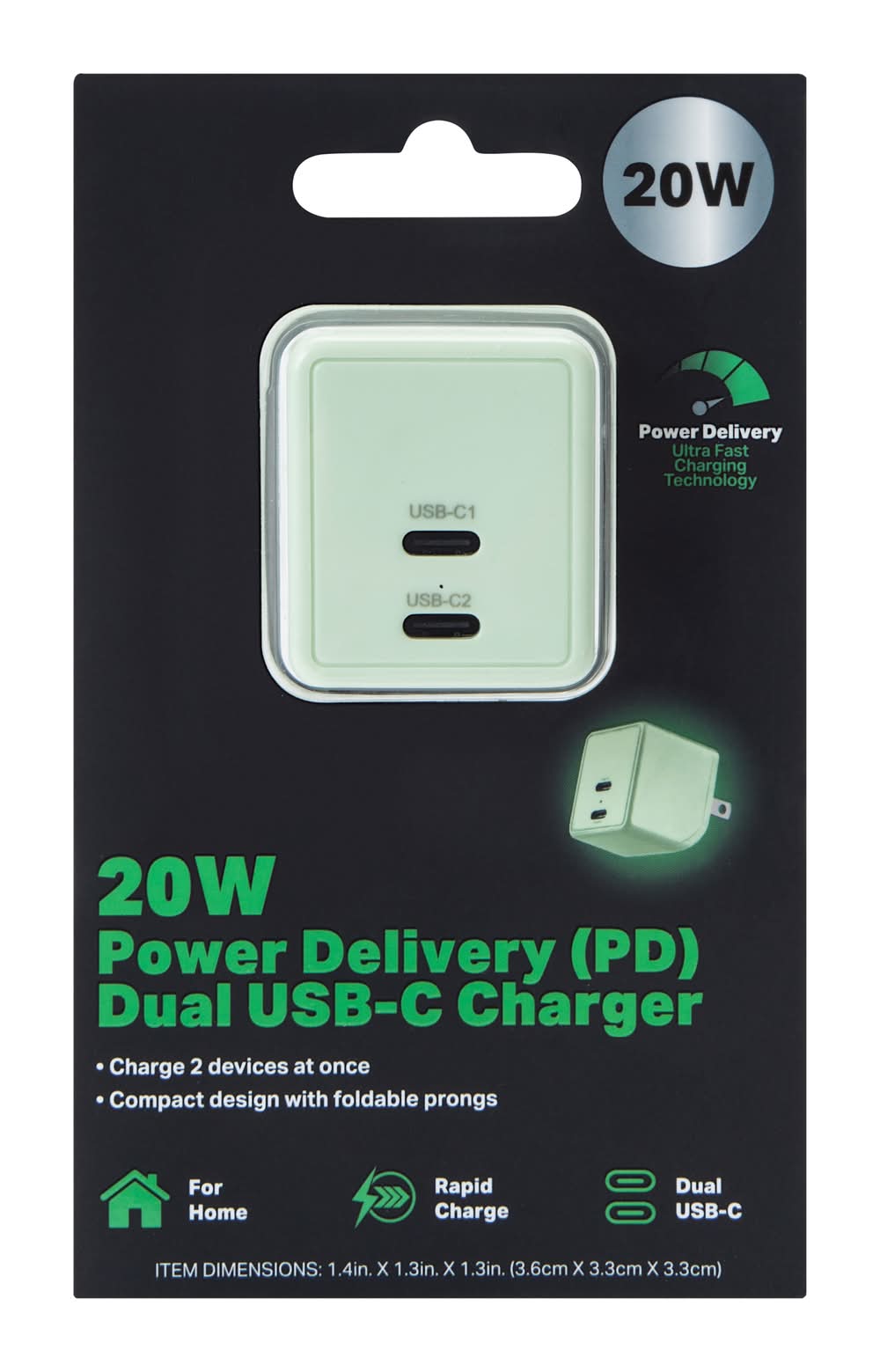 Power up with a Dual USB-C Charger for ultra-fast charging technology. Rapid charge 2 devices at once!Perf for travel20WWarning: This product can expose you to chemicals including Bisphenol A (BPA), which is known to the State of California to cause birth defects or other reproductive harm. For more information, go to www. P65Warnings.ca.gov/productCountry of Origin: Imported Color: Green