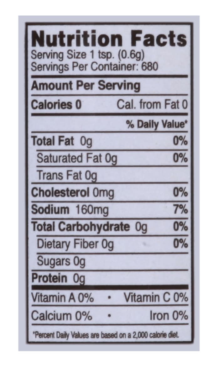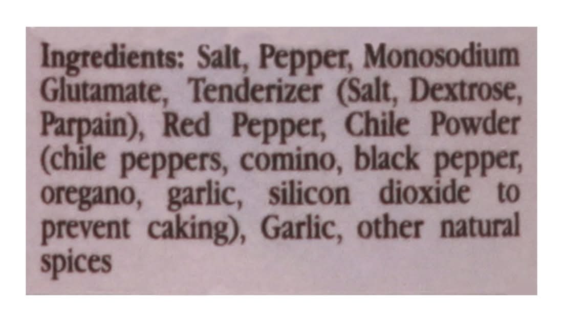 Salt, Pepper, Monosodium Glutamate, Tenderizer (Salt, Dextrose, Parpain), Red Pepper, Chile Powder (Chile Peppers, Comino, Black Pepper, Oregano, Garlic, Silicon Dioxide to Prevent Caking), Garlic, Other Natural Spices Contains: Soybeans, Milk, Wheat, Sesame