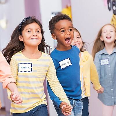 This pack of 100 Avery Self-Adhesive Name Badges lets you create polished, professional-quality name tags like a pro with minimal time and effort. Create polished, professional-quality customized name tags with minimal time and effort using Avery adhesive name tags. These name tag labels have a stylish blue border and use a removable adhesive that sticks securely to clothing but removes cleanly and easily when your event has ended. The name badge stickers firmly affix to most fabrics without curling, lifting or falling off, but are not recommended for use on delicate materials, including corduroy, plastic, leather, silk, suede, velvet or vinyl. Customized name badges are fantastic for business seminars, support groups, class reunions, bible study, office parties and other events. The printable rectangle labels also make great organization labels, gift tag labels, arts and craft stickers and more. Perfect for teachers, these personalized label stickers can be used as student name tags for classrooms, desk name tags, labeling supplies and more. Add that personal touch to your personalized custom name badge by hand or customize them easily using the free templates and designs on the Avery website, and print the 4 x 6 sheets on your laser or inkjet printer. Item comes with 100 blank name tags with blue border. - Quickly create custom name tag stickers by hand or print your custom stickers on the 4 x 6 sheets with your laser or inkjet printer - Easily create custom name tags using the free designs and templates on the Avery website - Great for use in the classroom, for volunteer work, on craft projects and labeling storage, these versatile rectangle labels let you personalize any event or situation - Keep your organization safer by creating temporary name badges on demand and adding 'screened', 'temperature tested' or other status indicators for anyone entering your site - Name badge labels stick firmly to most fabrics without curling or falling off, yet remove cleanly and easily - 4 x 6 sheets can be printed in your laser or inkjet printer, or handwritten - Two badges per sheet Customization Potential The generous size of these Avery name badges make them easy to customize. Write the name of each person in large print, or add more information, such as a job title or company name. You can also add a company logo. These labels also work in printers, and printing the labels is an ideal option if you want professional-quality results. Strong, Neat Adhesive Press these Avery name tags onto clothing easily, thanks to the self-adhesive design. They stick to a range of materials, including leather, suede, vinyl, plastic and corduroy. The removable adhesive means you can safely remove these badges without leaving sticky residue behind. Easy to Read Whether you print or write the names, these labels make the information easy to read. A crisp white background makes text and images of all colors stand out. The large size lets you use larger fonts for additional readability, and the blue border adds a colorful touch.