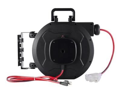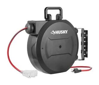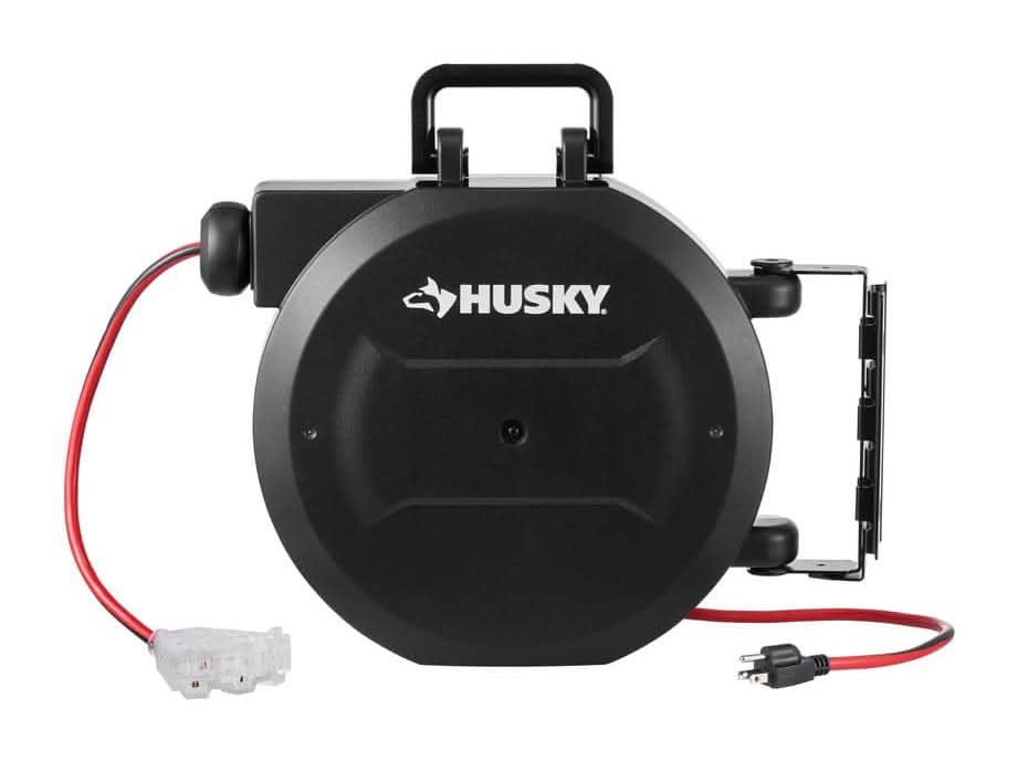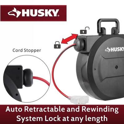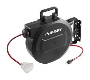 This Husky 50 ft. 14/3 Medium Duty Indoor Extension Cord Reel is a power station with a 3 outlet, triple tap end. With a clever auto-guide rewind mechanism to avoid kinks and tangles, the power cord reel will retract the 50 ft. extension cord quickly and smoothly; the ratcheting system can also lock the cord at any length you need. Featuring a mounting bracket that can easily be affixed to a wall or a bench. Color: Black