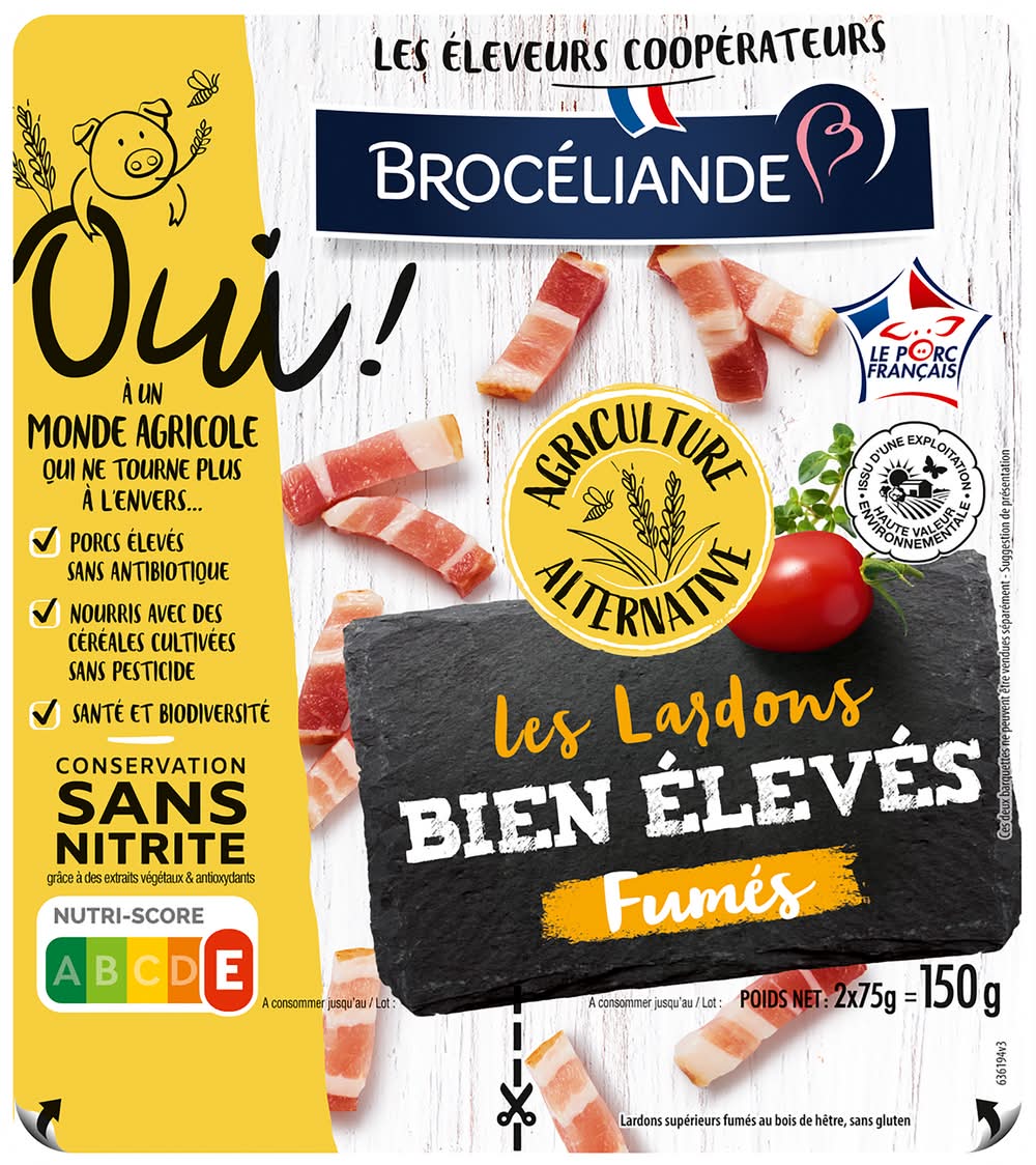 Le produit est préparé à partir de poitrine de porcs français élevés sans antibiotique dès la naissance et nourris sans OGM (<0,9%). Les porcs sont nourris avec des céréales cultivées sans pesticide dès la fin du sevrage et ils sont issus d'une exploitation Haute Valeur Environnementale. Le produit est étuvé, fumé au bois de hêtre, refroidi, tranché, conditionné. Conservation sans nitrite grâce à des extraits végétaux et des antioxydants. Brocéliande, BP 60328 22403 Lamballe Armor Cedex