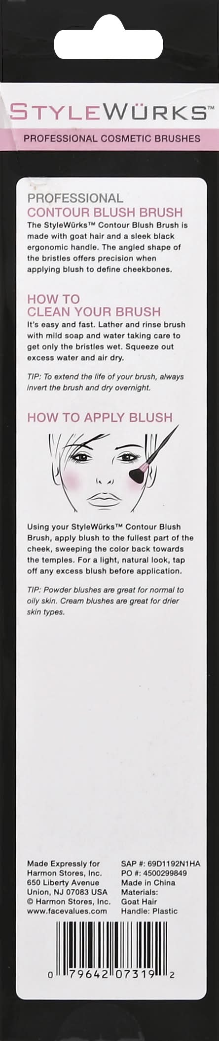 How to Clean Your Brush: It's easy and fast. Lather and rinse brush with mild soap and water taking care to get only the bristles wet. Squeeze out excess water and air dry. Tip: To extend the life of your brush, always invert the blush end dry overnight. How to Apply Blush: using your StyleWurks Contour Blush Brush, apply blush to the fullest part of the cheek, sweeping the color back towards the temples. For a light, natural look, tap off any excess blush before application. Tip: Powder blushes are great for normal to oily skin. Cream blushes are great for drier skin types.