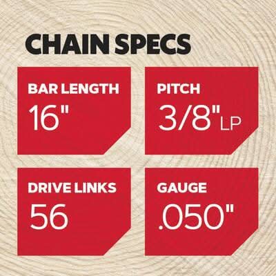 The Oregon S56 16 in. Semi Chisel Chainsaw Chain cuts smoothly thanks to its top performing Chamfer Chisel cutters. It also features notched bumper drive link for low kickback performance, good chip flow, and a smooth cutting action. The twin corners of the cutters on S56 chain deliver superior performance on the many popular saws which use This product can expose you to chemicals including Nickel, which is known to the State of California to cause cancer. For more information go to www.P65Warnings.ca.gov Size: 16 in
