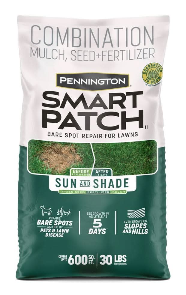 With Pennington Smart Patch, you don't need to know why your lawn has thin, bare or brown spots. Smart Patch eliminates the guesswork and frustration of lawn repairs. This product has everything you need to fix bare spots, neutralize soil and disease problems, and grow thick, lush, water-conserving grass - even on slopes and hills. Pet damage and dog urine spots? Repair with no problem. Lawn disease and poor soil conditions? That's covered, too. With Smart Patch, you'll see quick results you can rely on. It's the smart choice for lawn repairs. Smart Patch Sun and Shade Mix is everything your lawn needs and more. This dynamic seeding mixture contains microbials with organic matter to fight and prevent lawn disease, patented American Ryegrass that is guaranteed to produce quick results, and a water-soluble tackifier that acts as a blanket for your seed, even protecting it against the rain on slopes and hills. Our Smart Patch seeding mixture is drought tolerant and contains just the right amount of fertilizer to help your lawn succeed, along with mulch that turns a lighter color when dry - notifying you that its time to water again. Plant this grass seed mix in the early spring or early fall and begin to see growth in as little as 5-days and full results as soon as 14-days. For optimum coverage, use 1 lb. per 4 sq. ft. For extended coverage use 1 lb. per 20 sq. ft. Size: 600 sq ft