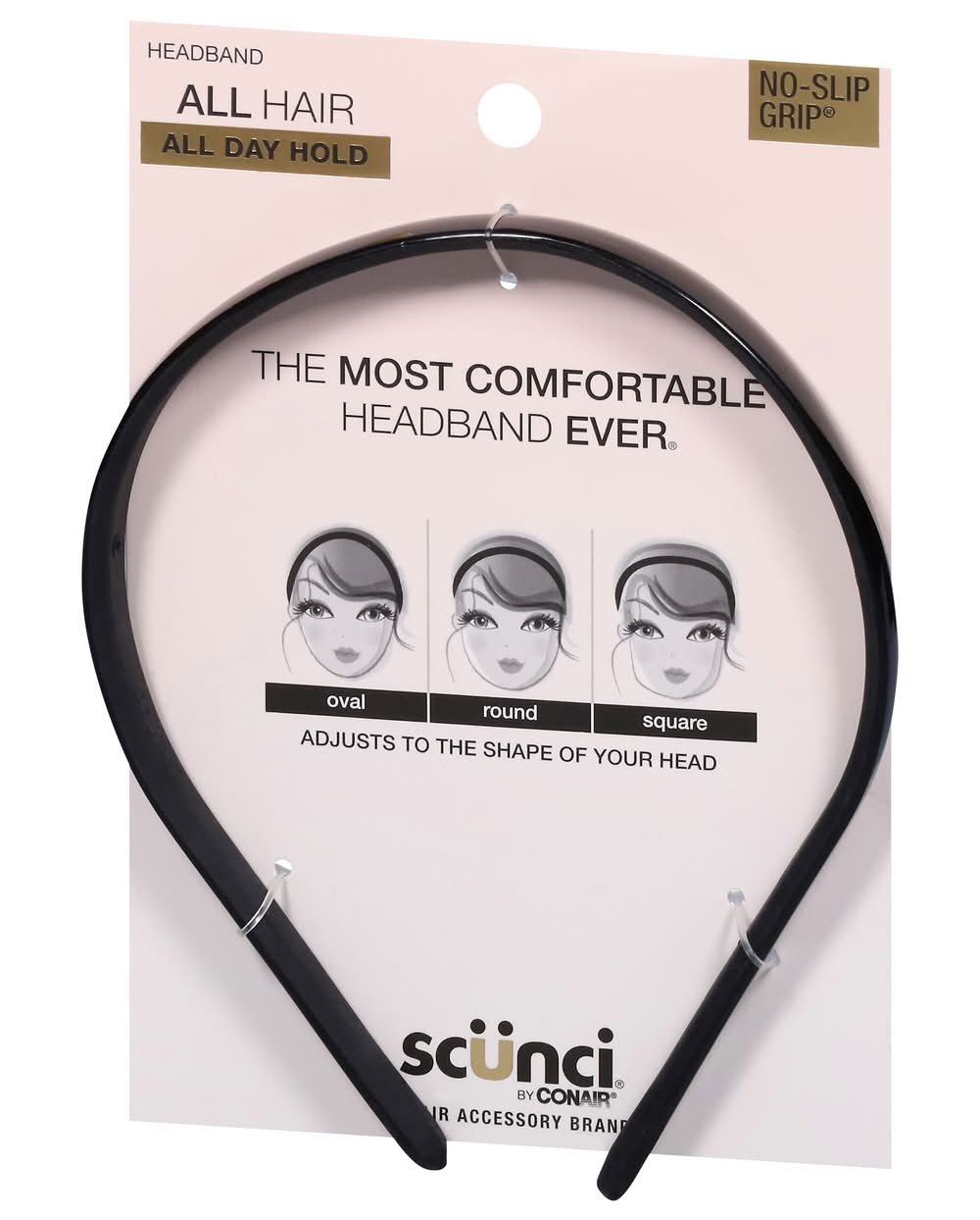 Crafted for a comfortable fit, the Scünci Bendable Headband is designed to conform to your head's unique shape. Whether your head is oval, round, or square, this headband offers a personalized fit by bending and forming to your contours. It's engineered for all-day wear, transitioning smoothly from daytime to nighttime use. Its construction aims to prevent discomfort behind the ears and stay securely in place. • Color: Black • Size: 1 CT • Conair Corporation, East Windsor,NJ,08520