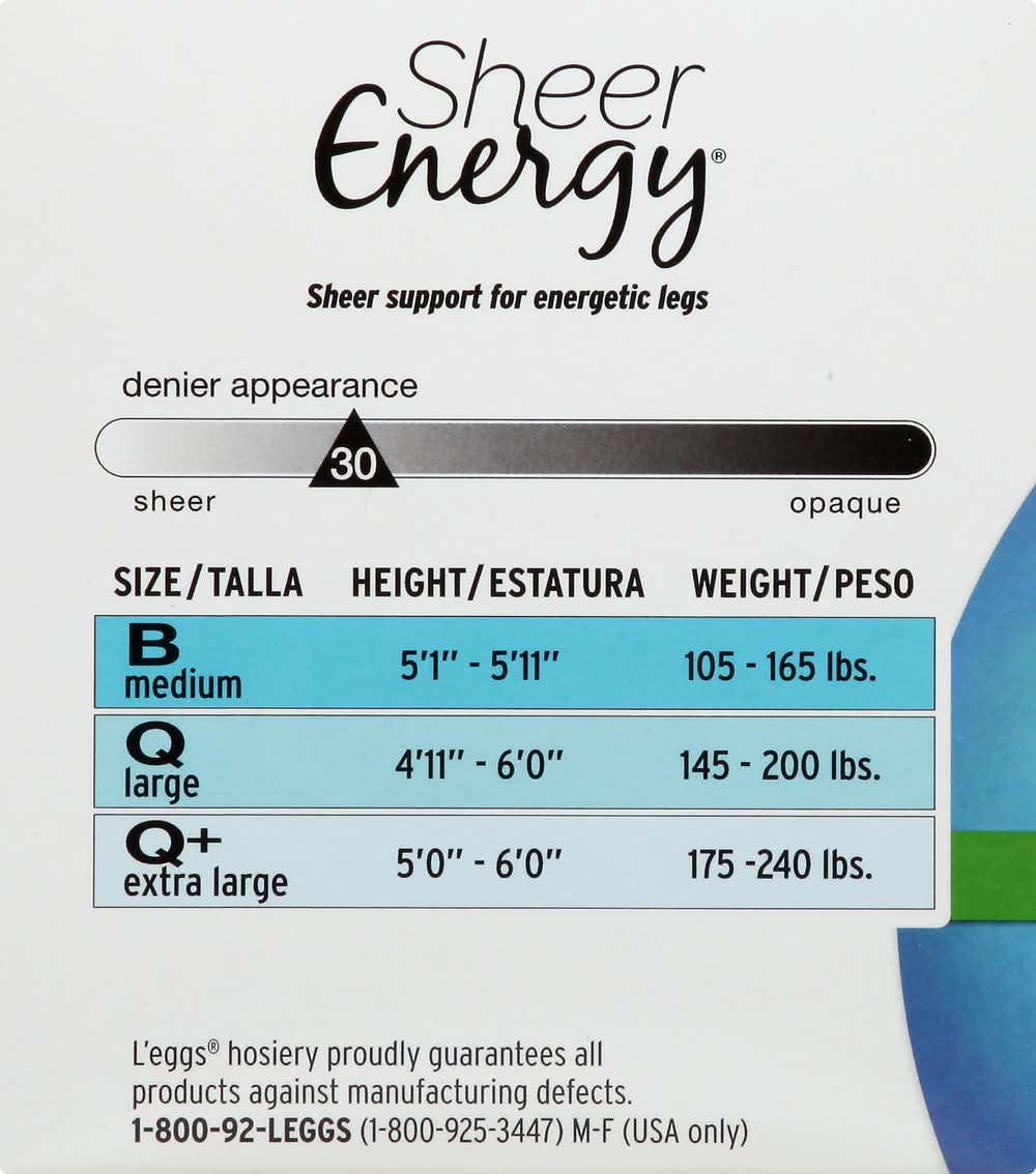 Your L'eggs Sheer Energy Size B Pantyhose delivery options may vary depending on where you are in a city. Enter your address to browse L'eggs Sheer Energy Size B Pantyhose delivery options near you.