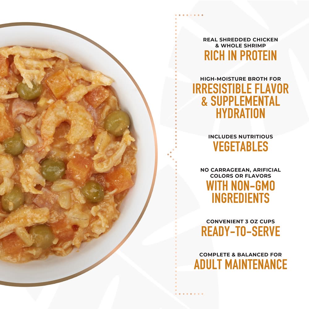 Ingredients: Chicken broth, chicken, brown rice, shrimp, carrots, green peas, sunflower seed oil, ham, calcium lactate, dicalcium phosphate, potassium chloride, salt, xanthan gum, choline chloride, magnesium sulfate, turmeric, paprika, tuna oil, thiamine mononitrate (vitamin B1), vitamin E supplement, ferrous sulfate, niacin (vitamin B3), zinc oxide, vitamin A supplement, biotin, vitamin B12 supplement, copper amino acid chelate, manganous oxide, calcium pantothenate, riboflavin, sodium selenite, pyridoxine hydrochloride (vitamin B6), folic acid, potassium iodide, vitamin D3 supplement.