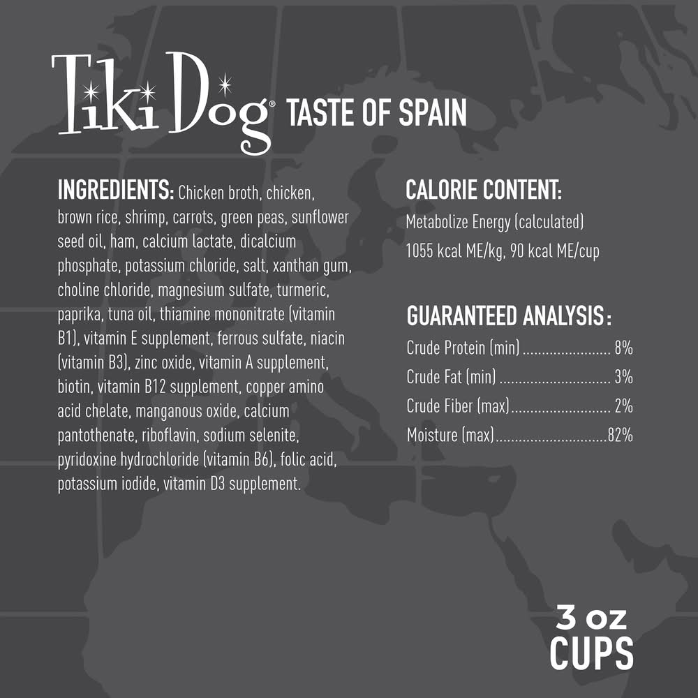 Treat your pup to a gourmet international experience with Tiki Dog Spanish Paella, a hearty meal with shrimp, chicken in a tomato base on a bed of savory rice for a true meal-time indulgence. • Size: 0.19 lb • Whitebridge Pet Brands - ProductXM, 1224 Fern Ridge Parkway, Suite 200, Saint Louis, Mo 63141