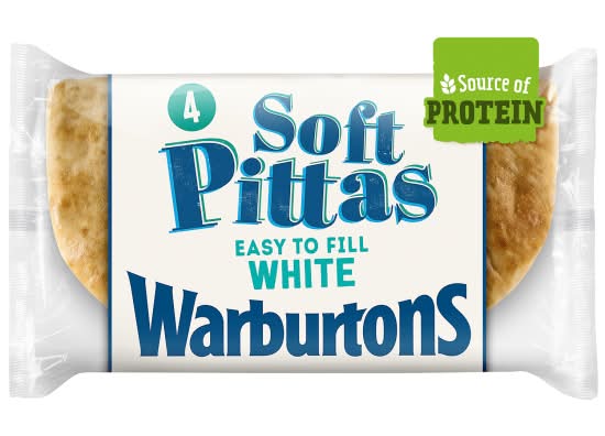 4 White Pitta Breads with Extra Virgin Olive Oil (0.5%). Family Bakers Easy to Fill Ready to fill No need to slice Vegetarian Society Approved - Vegan. It's a 'pitta' that it's difficult to open and fill most pittas. That's why we've developed our own which are super soft, easy to open and fill. Warburtons Limited, Hereford Street, Bolton, BL1 BJB.