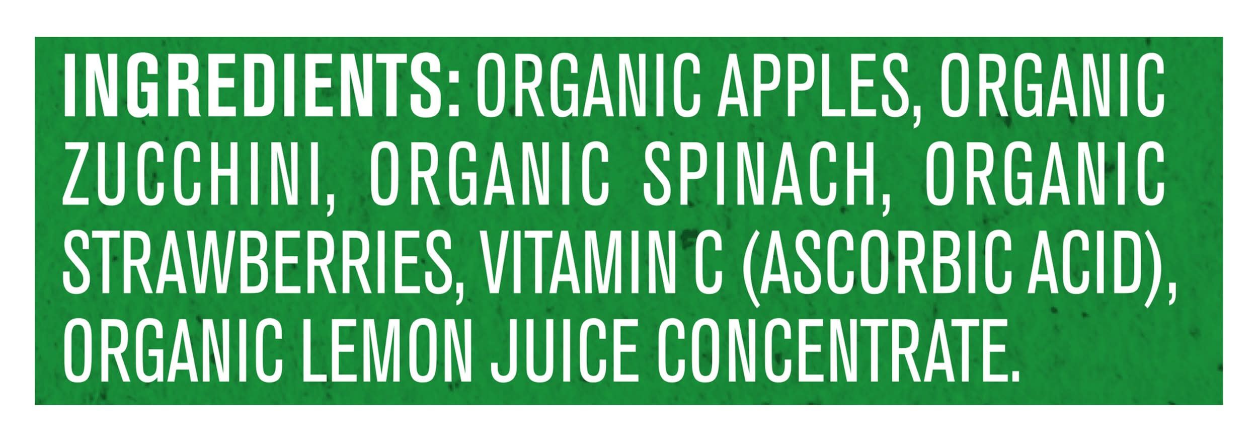 Ingredients: Organic Apples, Organic Zucchini, Organic Spinach, Organic Strawberries, Vitamin C (Ascorbic Acid), Organic Lemon Juice Concentrate