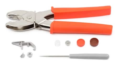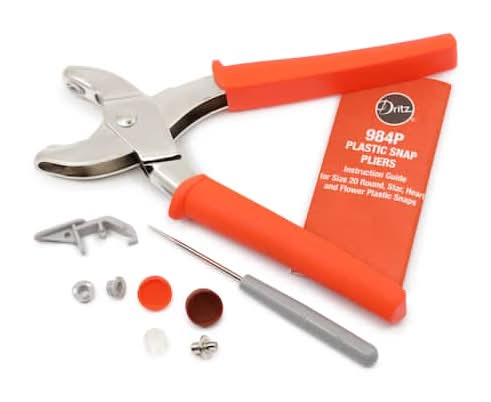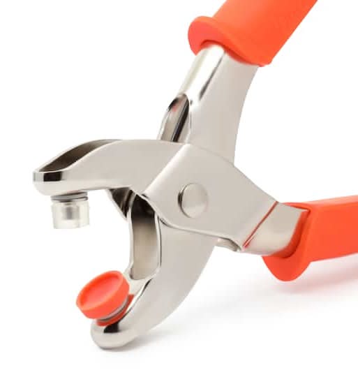Use these pliers to apply plastic snap fasteners to a variety of DIY sewing and repair projects such as children’s wear. 4 tools2 replacement Inserts. 2 replacement Inserts1 pliers. 1 pliers1 awl. 1 awl1 Tool Remover. • Color: Orange • Size: 20