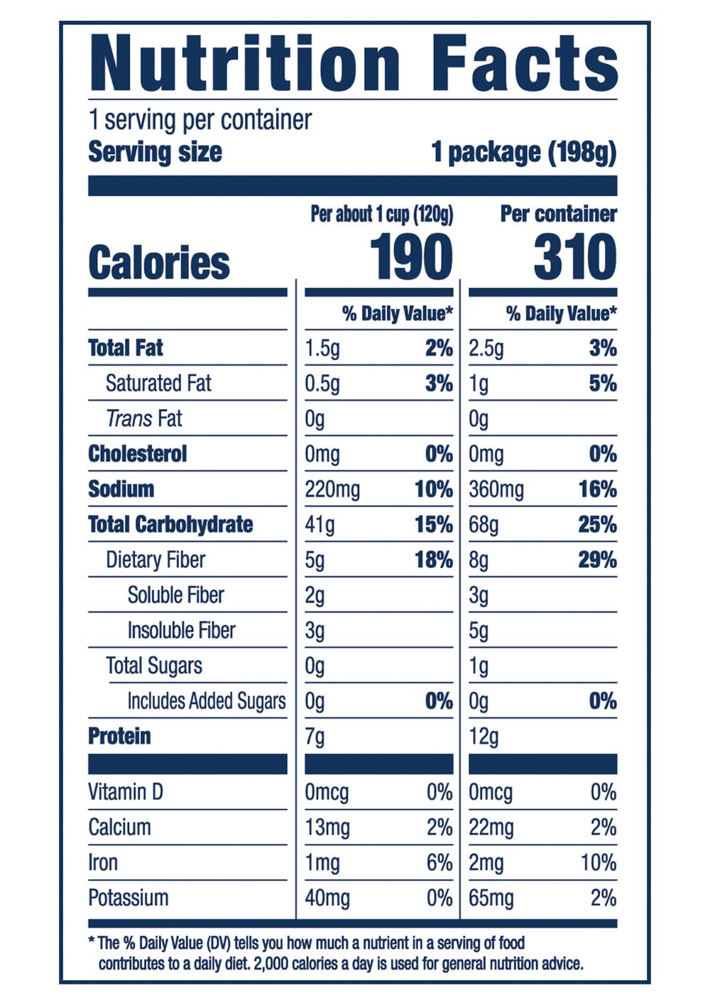 Directions for use: Directions: 1. Open: Gently knead pouch to separate pasta. Tear to vent prior to cooking. 2. Heat: Microwave for 60 seconds. Or on Stove: Pour pasta and tsp. oil in skillet. Stir 2-4 minutes until heated. 3. Add: Your favorite ingredients and enjoy! Caution: Steam in pouch will be hot, use cool touch zones when handling. Refrigerate leftovers & use within 2 days of opening. Storage recommendation: Refrigerate leftovers & use within 2 days of opening.