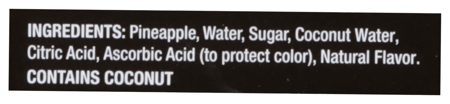 Pineapple, Water, Sugar, Coconut Water, Citric Acid, Ascorbic Acid (to Protect Color), Natural Flavor Contains: Tree Nuts, Coconuts