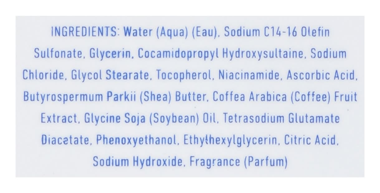 Water (Aqua) (Eau), Sodium C14-16 Olefin Sulfonate, Glycerin, Cocamidopropyl Hydroxysultaine, Sodium Chloride, Glycol Stearate, Tocopherol, Niacinamide, Ascorbic Acid, Butyrospermum Parkii, (Shea) Butter, Coffea Arabica (Coffee) Fruit Extract, Glycine Soja (Soybean) Oil, Tetrasodium Glutamate Diacetate, Phenoxyethanol, Ethylhexylglycerin, Citric Acid, Sodium Hydroxide, Fragrance (Parfum) Contains: Tree Nuts, Sheanuts, Soybeans