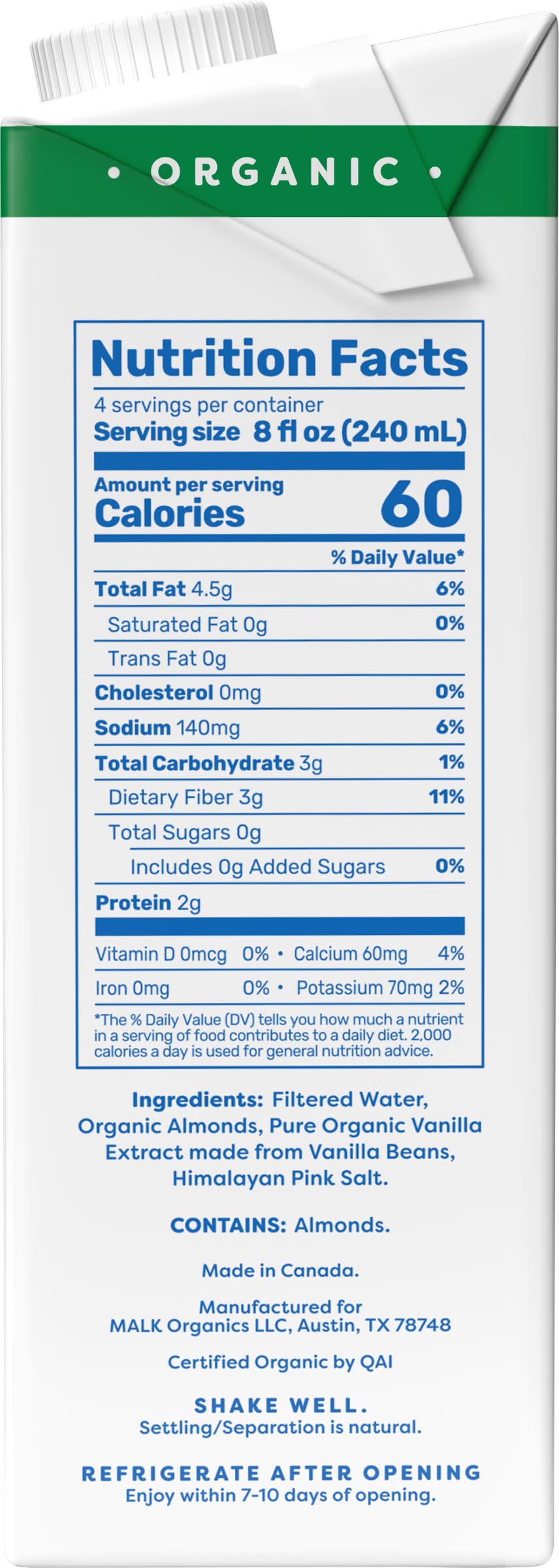Filtered Water, Organic Almonds, Pure Organic Vanilla Extract Made from Vanilla Beans, Himalayan Pink Salt Contains: Tree Nuts, Almonds