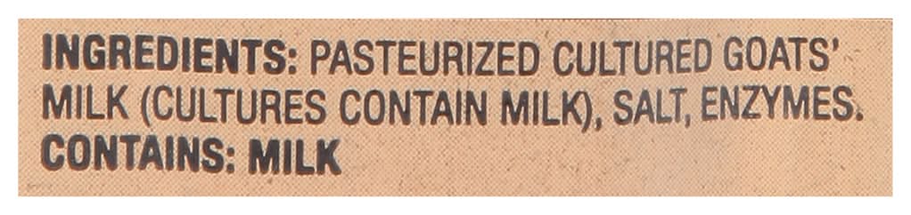 Pasteurized Cultured Goats' Milk (Cultures Contain Milk), Salt, Enzymes