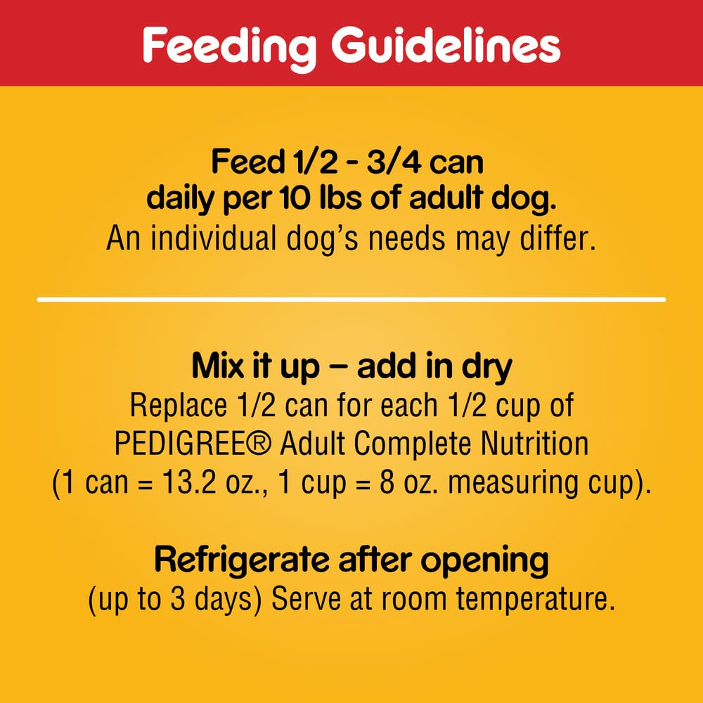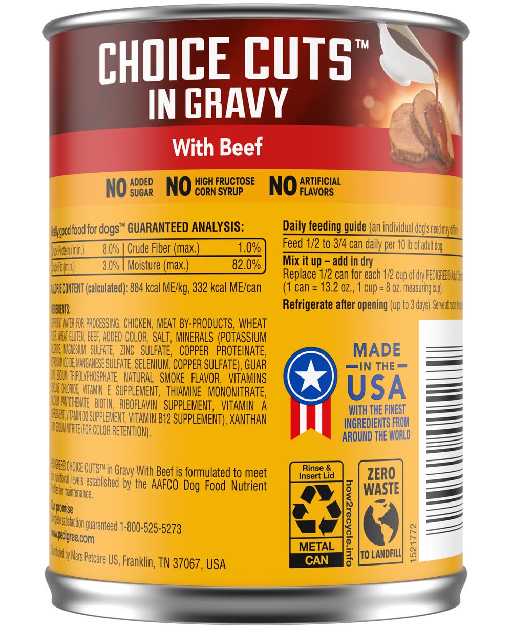 PEDIGREE CHOICE CUTS IN GRAVY soft, wet dog food with beef gives your dog the flavors they crave with the nutrition they need. Your adult dog can enjoy the delicious taste of real beef and delectable gravy sauce in every bite with our hearty wet dog food. PEDIGREE formulas provide the perfect balance of vitamins and minerals with no artificial flavor, no added sugar, and no high fructose corn syrup. Each recipe is balanced for adult dogs, so you know they are getting the most from their wet dog food. You can serve this dog food as a topper, mixer or on its own. Any way you serve it up, PEDIGREE canned dog food can help your dog grow happy and healthy.