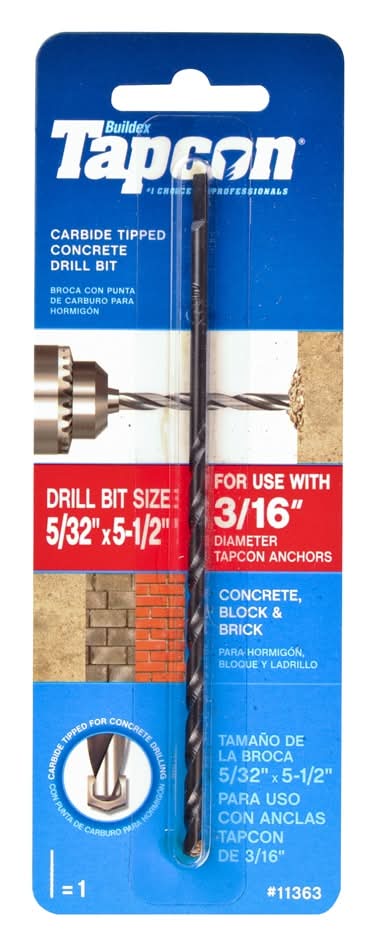 Designed for fastening into solid concrete, brick or hollow block. Engineered to seamlessly work with Tapcon concrete screw anchors ensuring an accurate fit. Carbide tip increases strength and durability allowing for repeated use. Tight bit tolerance provides maximum anchor performance. Manufactured with higher tolerances than ANSI standards. An accurate fit so anchors install quick and last long. Precise holes in order to achieve maximum holding power. Increased drive and holding power when used with Tapcon anchors. Less breakage on the job.