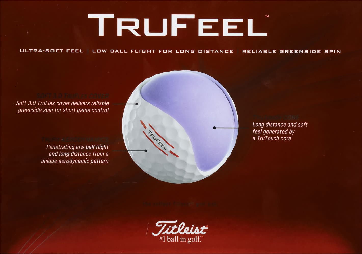 TECHNOLOGYFor players who prioritize soft feel and trust the Titleist brandLong distance and soft feel generated by a new TruTouch corePenetrating low ball flight and long distance from a unique aerodynamic patternSofter 3.0 TruFlex cover delivers increased greenside spin for short game controlFEATURESLong distance and soft feel from a new TruTouch coreLow penetrating ball flight from unique 376 tetrahedral dimple designIncreased greenside spin and control from a softer 3.0 TruFlex coverBENEFITSUltra-soft feelIncreased greenside spin for short game controlPenetrating low ball flight for long distanceTrusted quality and consistency. Golf Color: White