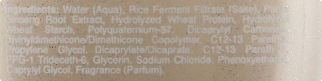 Water (Aqua), Rice Ferment Filtrate (Sake), Panax Ginseng Root Extract, Hydrolyzed Wheat Protein, Hydrolyzed Wheat Starch, Polyquaternium-37, Dicaprylyl Carbonate, Divinydimethicone/Dimethicone Copolymer, C12-13 Pareth-3 Propylene Glycol, Dicaprylate/Dicaprate, C12-13 Pareth-3, Propylene Glycol, Dicaprylate/Dicaprate, C12-13 Pareth-23, PPG-1 Trideceth-6, Glycerin, Sodium Chloride, Phenoxyethanol, Caprylyl Glycol, Fragrance (Parfum) Contains: Wheat