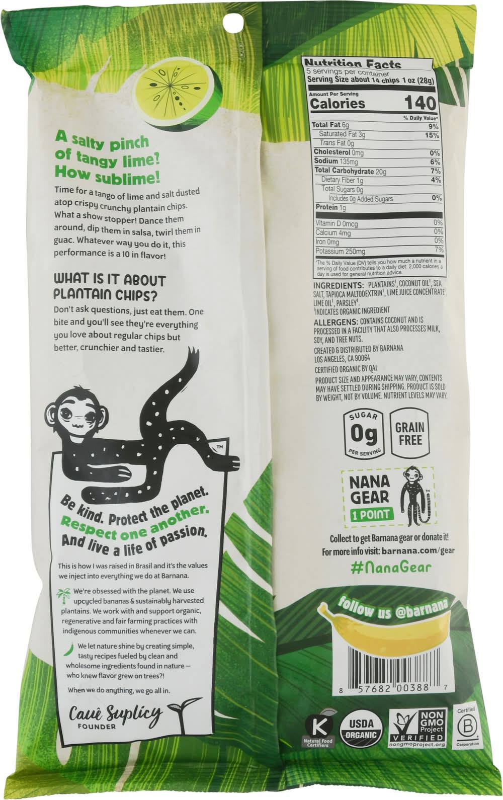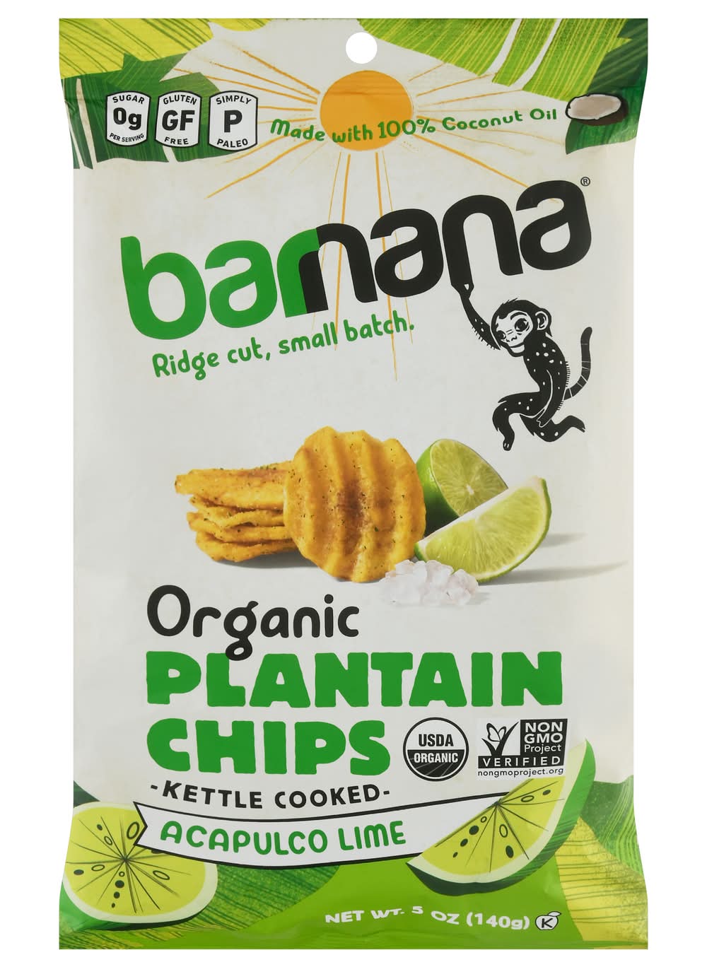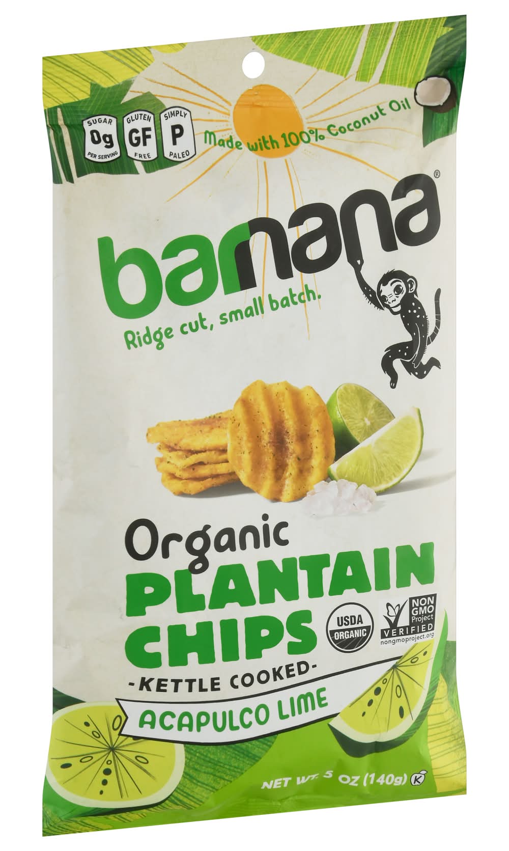 Ingredients: Plantains (Indicates Organic Ingredients), Coconut Oil (Indicates Organic Ingredients), Sea Salt, Tapioca Maltodextrin (Indicates Organic Ingredients), Lime Juice Concentrate (Indicates Organic Ingredients), Lime Oil (Indicates Organic Ingredients), Parsley (Indicates Organic Ingredients) Contains: Tree Nuts, Milk, Soybeans