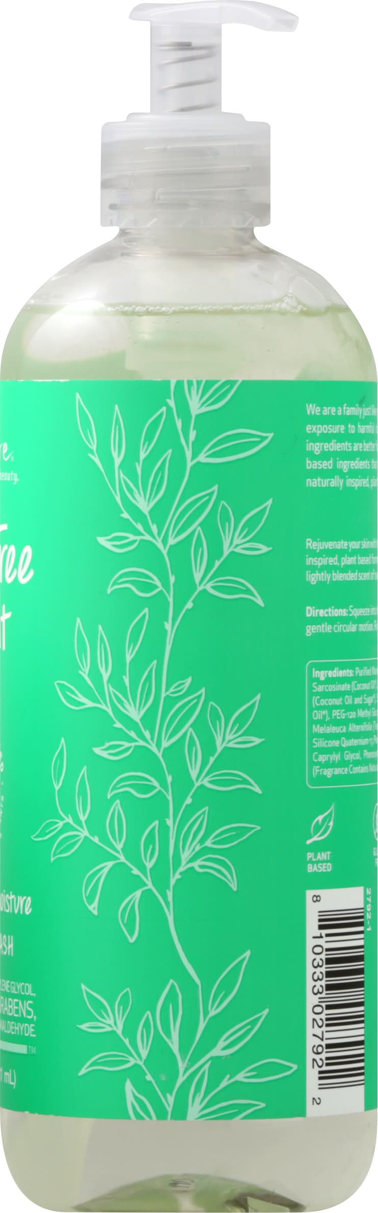 Purified Water, Cocamidopropyl Betaine (Coconut Oil (Derives Source)), Sodium Lauroyl Sarcosinate (Coconut Oil (Derives Source)), Lauryl Glucoside (Coconut Oil and Sugar (Derives Source)), Decyl Glucoside (Coconut Oil and Sugar), Sodium Lauroyl Lactylate (Palm Oil), Glycerin (Vegetable Oil (Derives Source)), PEG-120 Methyl Glucose Dioleate (Rapeseed Oil (Derives Source)), Methyl Gluceth-10 (Sugar (Derives Source)), Melaleuca Alternifolia (Tea Tree (Derives Source)), Leaf Oil, Polysorbate 20 (Coconut Oil & Sugar (Derives Source)), Silicone Quaternium-17, Phenethyl Alcohol, Polyquaternium-10, Citric Acid (Fruit Acid (Derives Source)), Caprylyl Glycol, Phenoxyethanol, Ethylhexylglycerin, Fragrance, (Fragrance Contains Natural Mint)