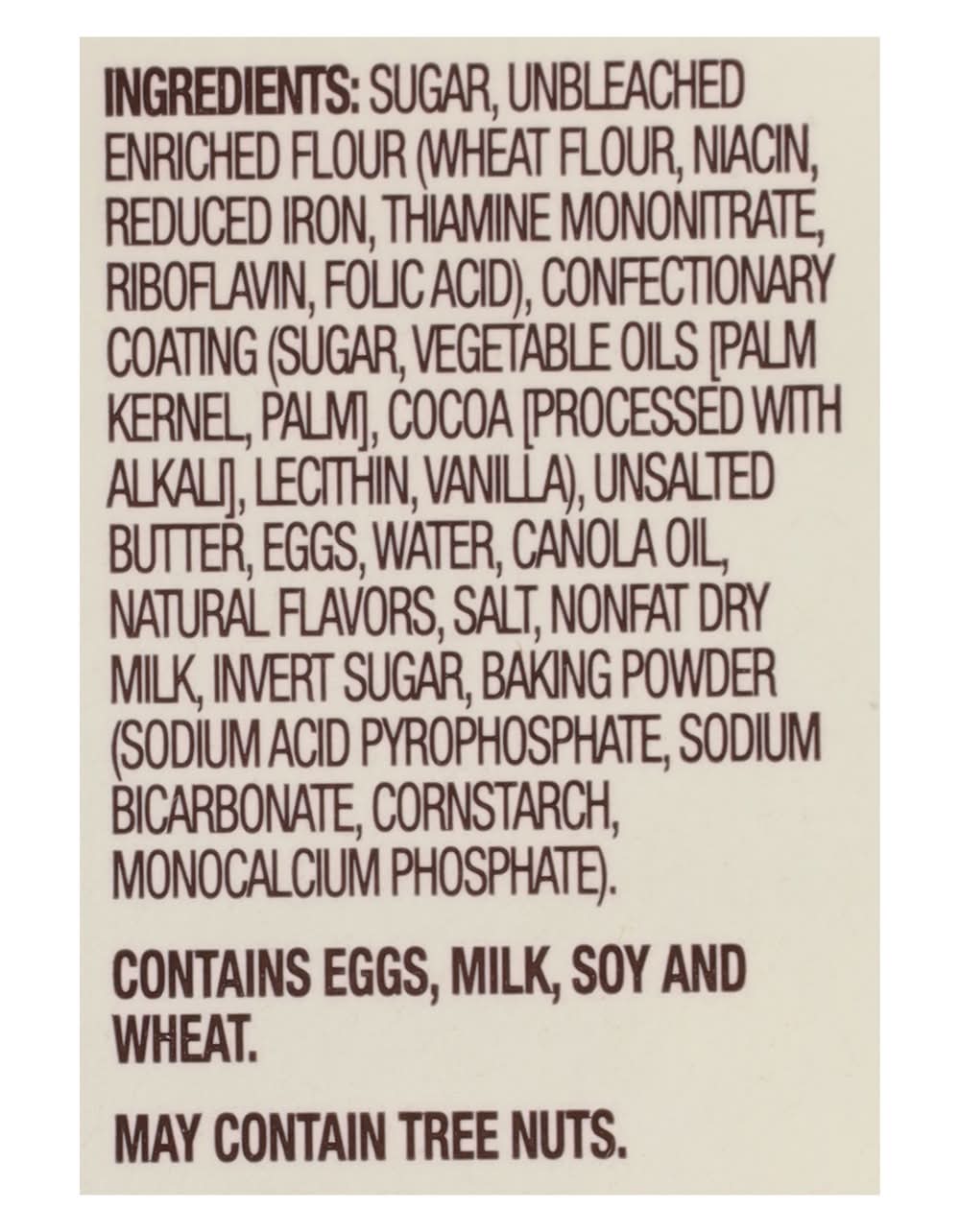 Sugar, Unbleached Enriched Flour (Wheat Flour, Niacin, Reduced Iron, Thiamine Mononitrate, Riboflavin, Folic Acid), Confectionary Coating (Sugar, Vegetable Oils [Palm Kernel, Palm], Cocoa [Processed with Alkali], Lecithin, Vanilla), Unsalted Butter, Eggs, Water, Canola Oil, Natural Flavors, Salt, Nonfat Dry Milk, Invert Sugar, Baking Powder (Sodium Acid Pyrophosphate, Sodium Bicarbonate, Cornstarch, Monocalcium Phosphate). Contains: Wheat, Eggs, Milk, Corn, Tree Nuts
