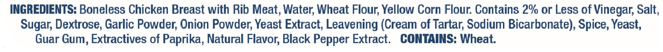 Boneless Chicken Breast with Rib Meat, Water, Wheat Flour, Yellow Corn Flour, Contains 2% or Less of Vinegar, Salt, Sugar, Dextrose, Garlic Powder, Onion Powder, Yeast Extract, Leavening (Cream of Tartar, Sodium Bicarbonate), Spice, Yeast, Guar Gum, Extractives of Paprika, Natural Flavor, Black Pepper Extract Contains: Wheat