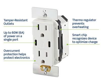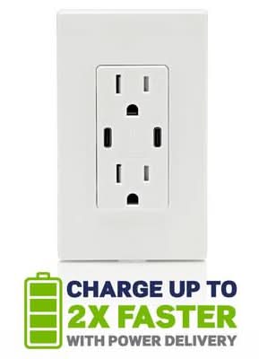 Charge for Minutes, Enjoy for Hours! Leviton's USB Wall Outlet with 60W Dual Type-C/C Power Delivery Charger is the most advanced USB wall outlet charger on the market offering up to 60-Watts of charging power on a single port. Power Delivery, a state-of-the-art charging technology, provides a higher power level so you can enjoy up to 2X faster charging of laptops, tablets, phones and more. Plus, it's fully compatible with iPhone 17 fast charging, delivering the required 40W power output for optimal performance. Engineered with advanced overcurrent protection and an internal thermoregulator to help ensure the safety of your electronics, Leviton's USB Wall Outlet with 60W Dual Type-C/C Power Delivery Charger is the ideal upgrade for home offices or anywhere you choose to charge. The device offers adapter-free charging which creates a clutter-free, modern aesthetic and leaves the outlets free for additional power needs. Use with a Decora wall plate or Decora Plus screwless wall plate (sold separately) to complement any decor. These products may contain a chemical known to the State of California to cause cancer, birth defects or other reproductive harm. www.p65warnings.ca.gov Color: White