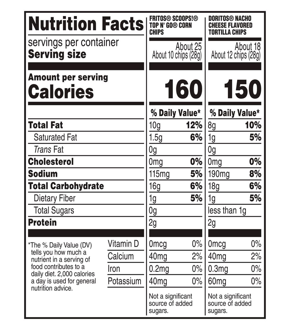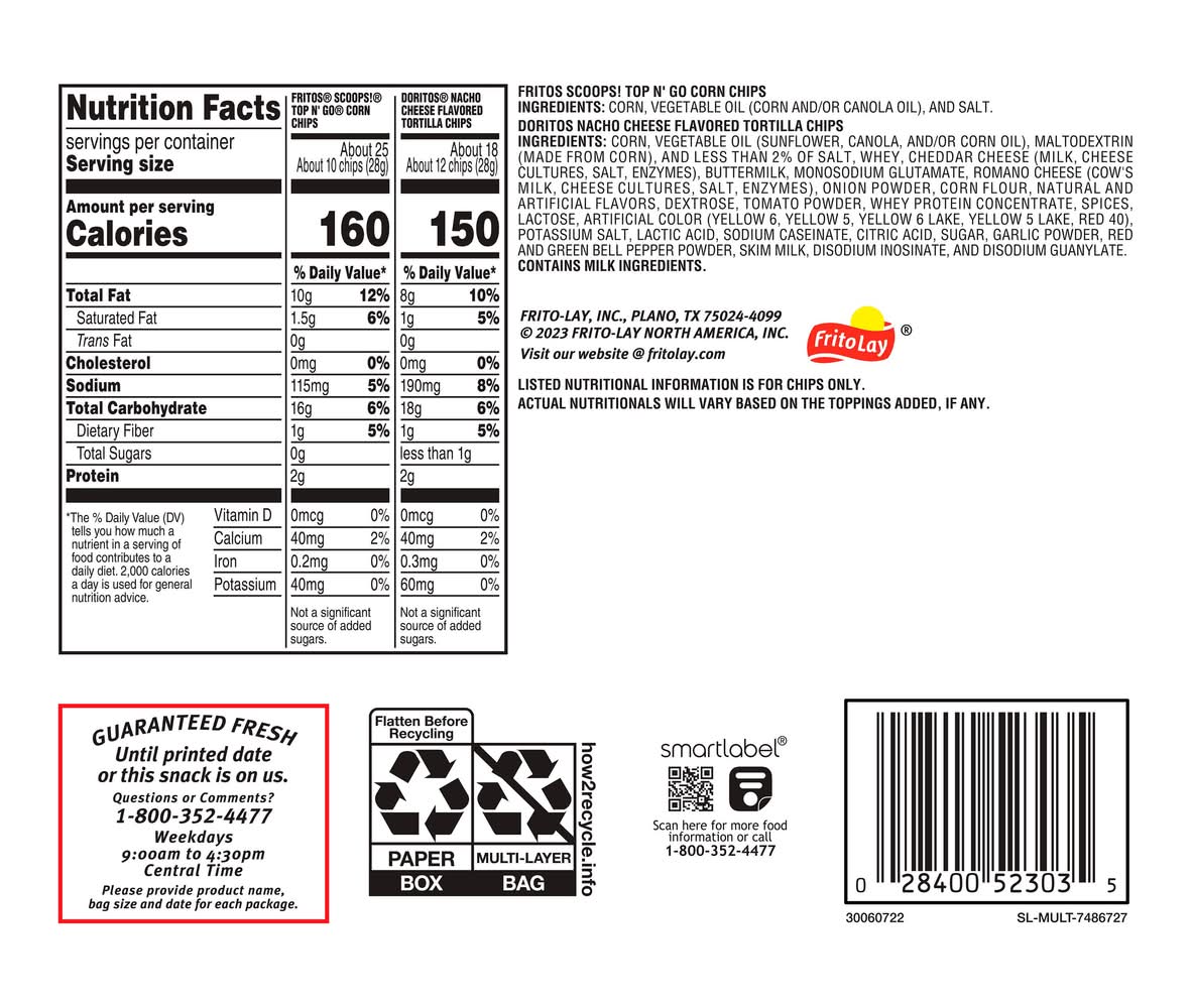 Fritos Scoops! Corn Chips Ingredients: Corn, Vegetable Oil (Corn, And/Or Canola Oil), And Salt. Doritos Nacho Cheese Flavored Tortilla Chips Ingredients: Corn, Vegetable Oil (Corn, Canola, Soybean, And/or Sunflower Oil), Corn Maltodextrin, And Less Than 2% Of Cheddar Cheese (Milk, Cheese Cultures, Salt, Enzymes), Salt, Whey, Monosodium Glutamate, Buttermilk, Romano Cheese (Milk, Cheese Cultures, Salt, Enzymes), Whey Protein Concentrate, Onion Powder, Potassium Salt, Corn Flour, Natural Artificial Flavors, Dextrose, Tomato Powder, Lactose, Spices, Artificial Color (Yellow 6, Yellow 5, Red 40), Lactic Acid, Citric Acid, Sugar, Garlic Powder, Skim Milk, Red And Green Bell Peppers, Disodium Inosinate, And Disodium Guanylate. CONTAINS MILK INGREDIENTS. Contains: Contains Milk Ingredients.
