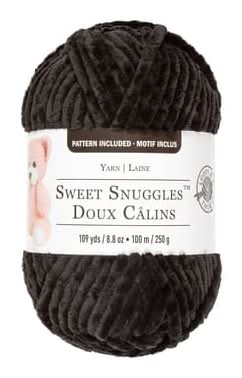 Find the Sweet Snuggles Yarn at Michaels. Use this soft yarn for your upcoming crafting projects to create afghans, sweaters, hats and scarves. Weight: 7 - Jumbo . Contents: 100% polyester . Skein Weight: 8.8 oz. / 250 g . Yardage: 109 yd. / 100 m . Knitting Gauge: 6 sts - 8 rows = 4" (10 cm) . Suggested Knitting Needle: 12.5 mm, US - 17 Color: Black