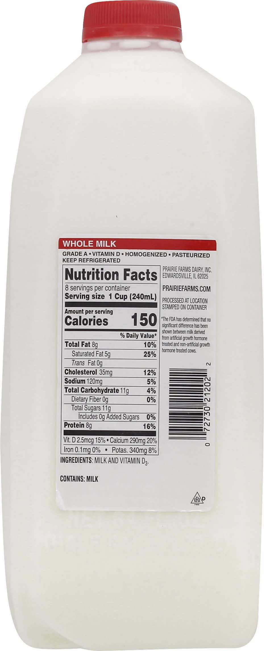 Farmer owned. Dedicated farmers. Happy cows. Real milk. Vitamin D. Pasteurized. Homogenized. No artificial growth hormones (The FDA has determined that no significant difference has been shown between milk derived from artificial growth hormone treated and non-artificial growth hormone treated cows). Grade A. • Alcohol by volume: 0% • Prairie Farms Dairy, Inc., Edwardsville, IL, 62025