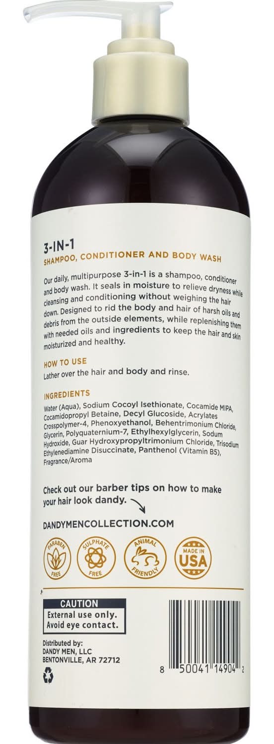 Simplify your routine with Dandymen's 3-in-1 Shampoo, Conditioner, and Body Wash. Embrace the ultimate grooming efficiency with Shampoo, Conditioner, and Body Wash. The all-in-one solution is meticulously formulated to cleanse and hydrate your hair, scalp, and skin, offering the perfect balance of care and convenience for the modern man. Packaging: Reusable