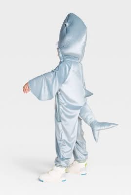 Made from polyester, this costume showcases a gray shark jumpsuit with a hood and tail. The hood features shark eyes and teeth, and the costume secures with a side zipper for easy dressing
