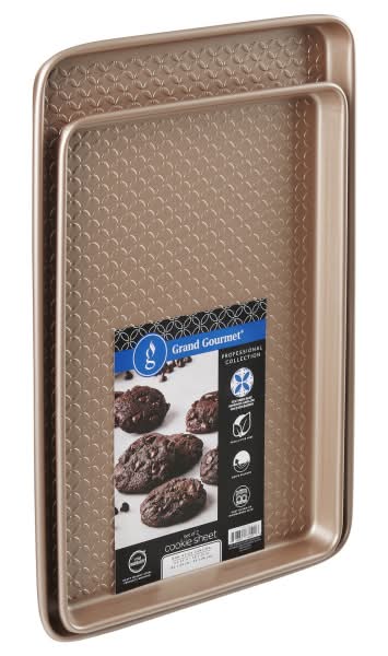 Crafted as part of the Grand Gourmet Professional Bakeware Collection, this Small & Medium Cookie Pan Set is constructed with a slightly heavier gauge metal and features a champagne finish for a touch of elegance. The pans are designed with a textured bottom that enhances air circulation, ensuring uniform baking. Additionally, the oversized handles provide easier handling when using oven mitts. Each pan is equipped with a superior non-stick coating, which simplifies the removal of baked goods.