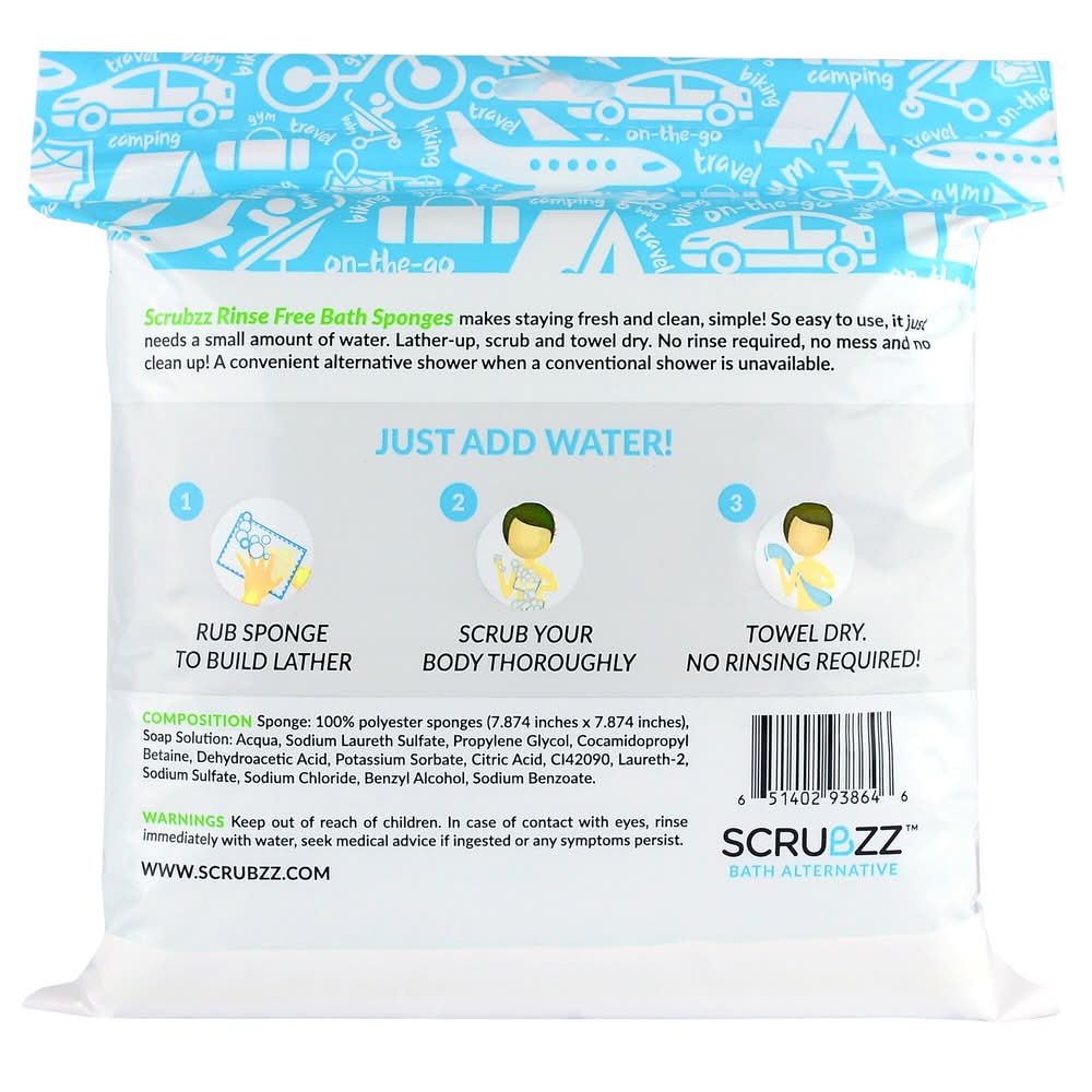 Scrubzz Disposable No Rinse Bathing Wipes - 25 Pack - All-in-1 Single Use Shower Wipes, Simply Dampen, Lather, and Dry Without Shampoo or Rinsing SCRUBZZ NO RINSE BATHING SPONGE is a unique bathing product designed to give you that CLEAN and FRESH feeling whenever and wherever you may need it! Simply put a little water on the "FEATHER LITE" sponge, work into a lather, cleanse, and dry! NO NEED TO RINSE!Our No Rinse Shower Sponge is HYPOALLERGENIC & PH BALANCED: the ingredients in the special formula ensure that your skin does not dry out or break out. Also ideal for people with sensitive skin or other allergies. NO SHAMPOO required-simply dry your skin with a towel to dry shampoo and soap.Our No Rinse Shower Sponge is HYPOALLERGENIC & PH BALANCED: the ingredients in the special formula ensure that your skin does not dry out or break out. Also ideal for people with sensitive skin or other allergies. NO SHAMPOO required-simply dry your skin with a towel to dry shampoo and soap. HIKERS and CAMPERS: Our no rinse wipes are a travel essential for anyone going hiking or camping in places where there may not be a shower nearby. Also an EMERGENCY STAPLE: Make sure you're always PREPARED! Our all in one lathering sponge can be a lifesaver in emergency situations and regions where water is scarce or not safe for use. Simply dampen the cloth to activate and easily sponge yourself clean.Scrubzz cleansing sponge is a must in any BATHING ESSENTIALS kit! 25 Sponge ECONOMY PACK! NEW RESEALABLE ZIPLOC STYLE BAG!! Buy one now and start enjoying the convenience of Scrubzz NO RINSE WIPES!