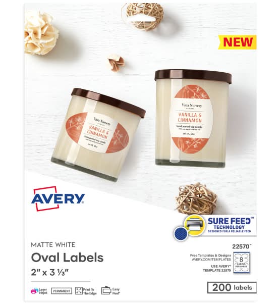 The versatile oval ID labels are ideal for labeling a variety of items, from product packaging, marketing materials and business presentation folders, to home canning projects, gift tags and party favors. Printable multipurpose labels feature Sure Feed technology for a reliable feed through your printer, to prevent misalignments and jams-and that means no more wasted labels. Full-bleed labels enable you to apply colors, images and text that print to the edge of the label for a professional look. Labels are easy to peel and quick to apply thanks to the proprietary Easy Peel labels sheets with the Pop-up Edge-just bend the label sheet to lift up the label edge. Labels are guaranteed to stick and stay. They're also archival safe and acid free to prevent yellowing and deterioration over time. Customize your labels with free designs and templates at avery.com/templates, and printable with laser and inkjet printers. Create professional looking labels with matte white labels that allow your colors to pop; personalize small business product labels, bottle labels, gifting and party favors, packaging, marketing materials, business folders, cans, jars and more . Get a more reliable feed through your printer with Avery blank labels featuring proprietary Sure Feed technology. Design and print vivid, professional looking sticker labels with our full bleed, print-to-the-edge feature that prints right to the edge without a border or outline. Save time with our Easy Peel with Pop-up Edge; simply bend the sheet back to pop up the edges of the white blank labels for quick and easy peeling. Printable labels stick and stay to a variety of surfaces including paper, cardboard, plastic, glass and painted metal with permanent label adhesive that prevents peeling, curling and falling off. Labels are acid free and archival safe to prevent yellowing and deterioration over time. Easily customize your printable blank labels with your own text and graphics or use the free templates and des • Pack size: 25 • Color: White
