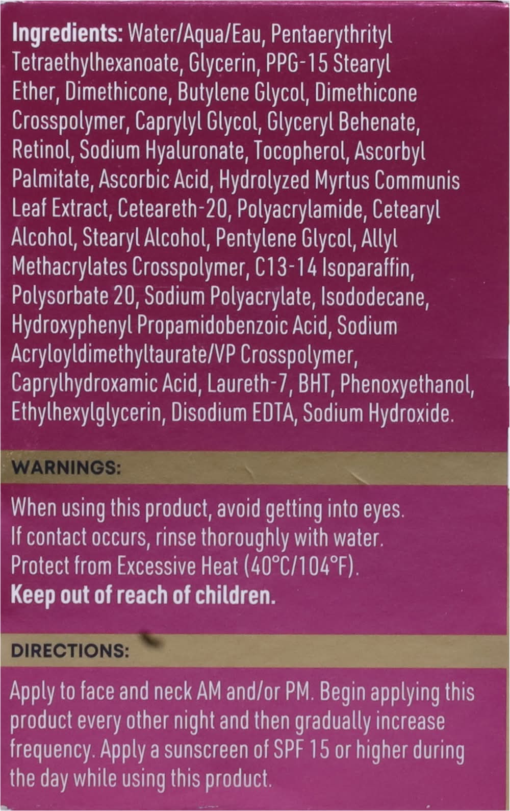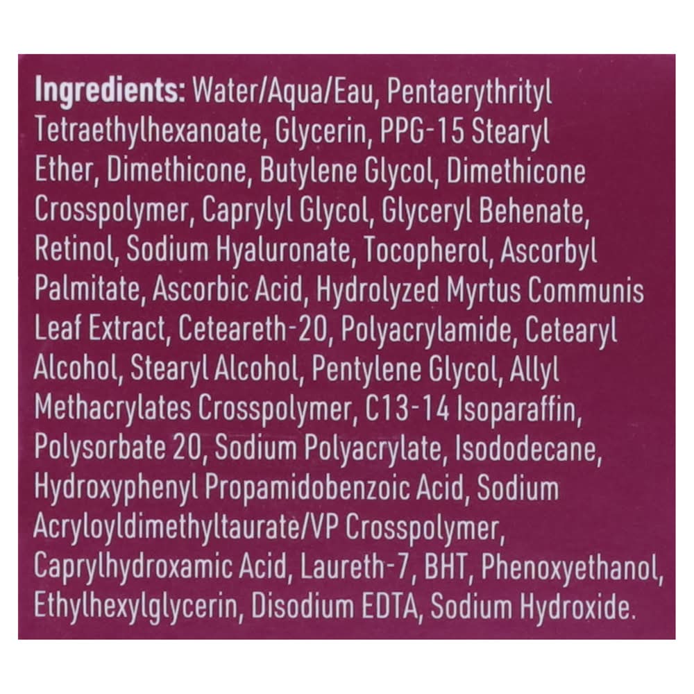 Ingredients: Water/Aqua/Eau, Pentaerythrityl Tetraethylhexanoate, Glycerin, PPG-15 Stearyl Ether, Dimethicone, Butylene Glycol, Dimethicone Crosspolymer, Caprylyl Glycol, Glyceryl Behenate, Retinol, Sodium Hyaluronate, Tocopherol, Ascorbyl Palmitate, Ascorbic Acid, Hydrolyzed Myrtus Communis Leaf Extract, Ceteareth-20, Polyacrylamide, Cetearyl Alcohol, Stearyl Alcohol, Pentylene Glycol, Allyl Methacrylates Crosspolymer, C13-14 Isoparaffin, Polysorbate 20, Sodium Polyacrylate, Isododecane, Hydroxyphenyl Propamidobenzoic Acid, Sodium Acryloyldimethyltaurate/VP Crosspolymer, Caprylhydroxamic Acid, Laureth-7, BHT, Phenoxyethanol, Ethylhexylglycerin, Disodium EDTA, Sodium Hydroxide