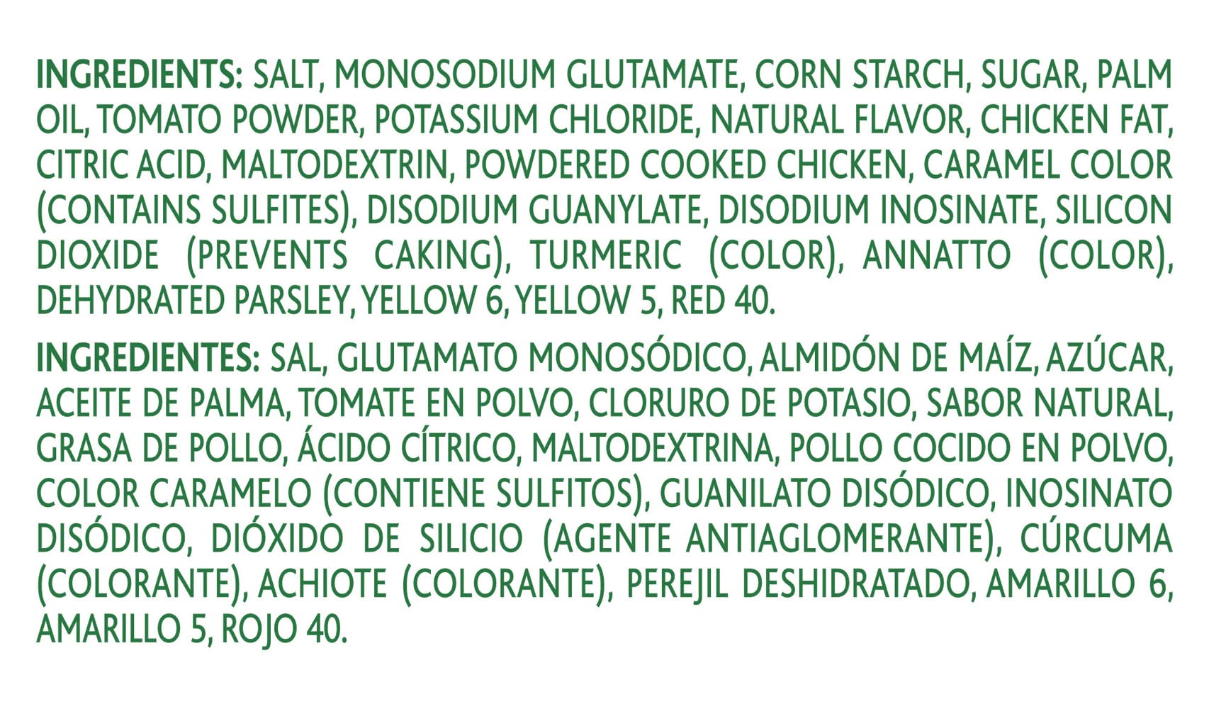 Salt, Monosodium Glutamate, Corn Starch, Sugar, Palm Oil, Tomato Powder, Potassium Chloride, Natural Flavor, Chicken Fat, Citric Acid, Maltodextrin, Powdered Cooked Chicken, Caramel Color Contains Sulfites, Disodium Guanylate, Disodium Inosinate, Silicon Dioxide Prevents Caking, Turmeric Color, Annatto Color, Dehydrated Parsley, Yellow 6, Yellow 5, Red 40.