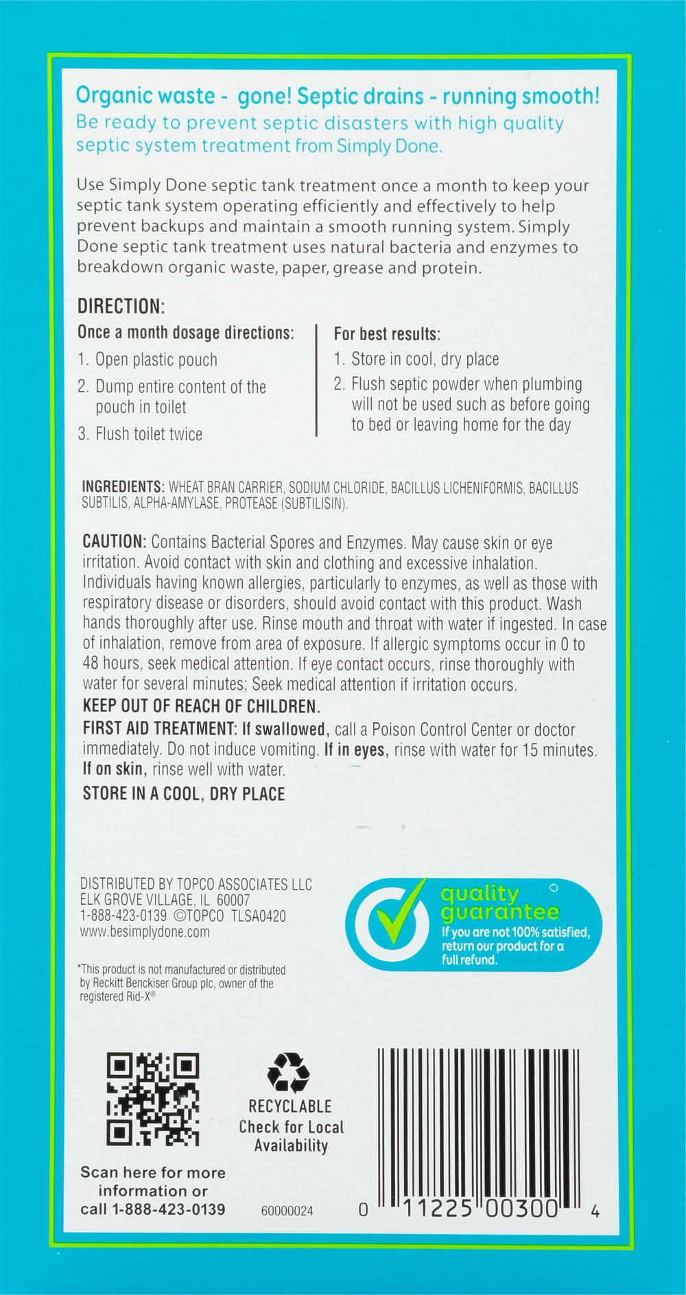 Directions for use: Direction: Once a month dosage directions: 1. Open plastic pouch. 2. Dump entire content of the pouch in toilet. 3. Flush toilet twice. For best results: 1. Store in cool, dry place. 2. Flush septic powder when plumbing will not be used such as before going to bed or leaving home for the day. Storage recommendation: Store in a cool, dry place.
