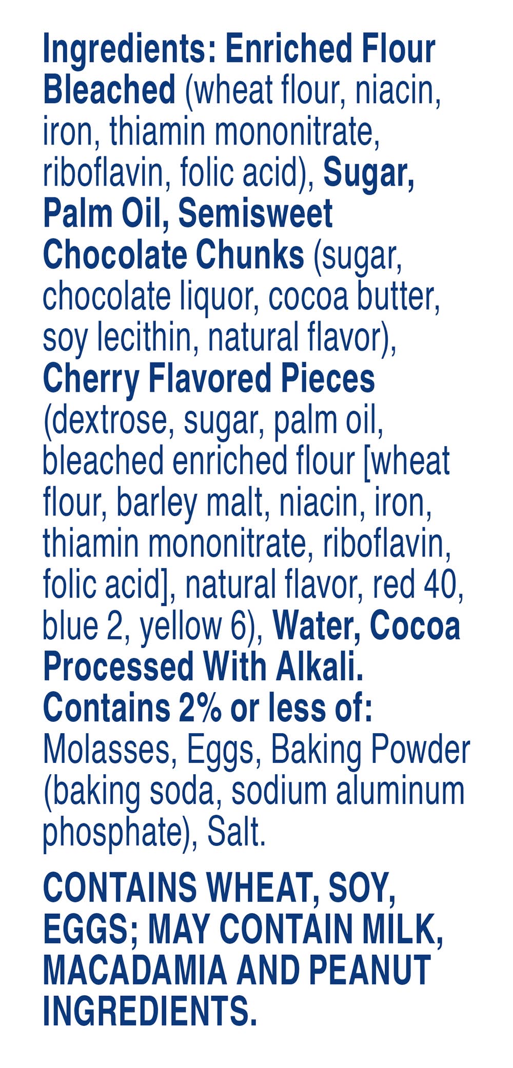 Ingredients: Enriched Flour Bleached (Wheat Flour, Niacin, Iron, Thiamin Mononitrate, Riboflavin, Folic Acid), Sugar, Palm Oil, Semisweet Chocolate Chunks (Sugar, Chocolate Liquor, Cocoa Butter, Soy Lecithin, Natural Flavor), Cherry Flavored Pieces (Dextrose, Sugar, Palm Oil, Bleached Enriched Flour [Wheat Flour, Barley Malt, Niacin, Iron, Thiamin Mononitrate, Riboflavin, Folic Acid], Natural Flavor, Red 40, Blue 2, Yellow 6), Water, Cocoa Processed with Alkali, Contains 2% or Less of: Molasses, Eggs, Baking Powder (Baking Soda, Sodium Aluminum Phosphate), Salt Contains: Wheat, Soybeans, Eggs, Barley, Milk, Tree Nuts, Macadamia Nuts, Peanuts Additives: Genetically Modified Ingredients