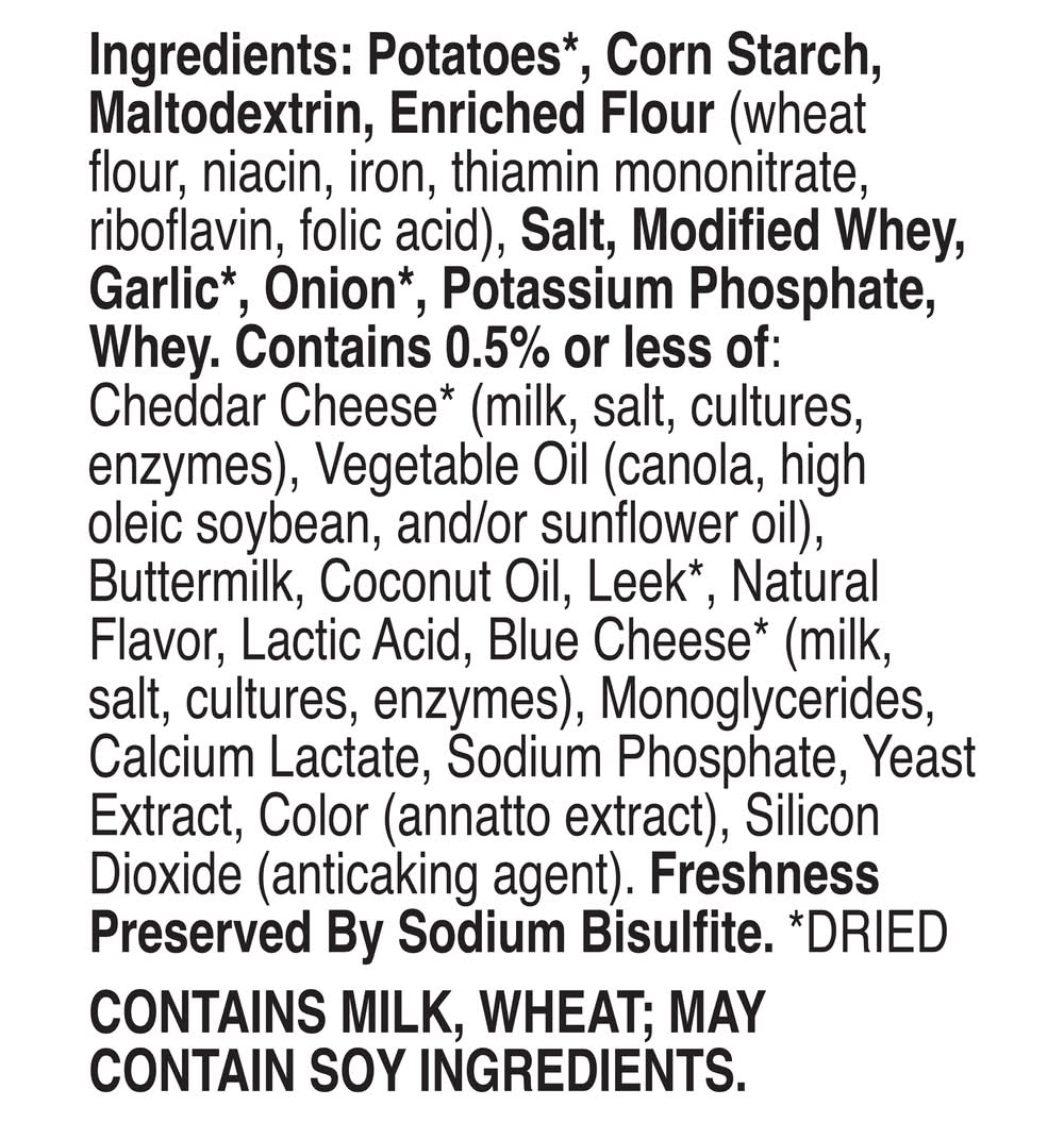 Ingredients: Potatoes*, Corn Starch, Maltodextrin, Enriched Flour (Wheat Flour, Niacin, Iron, Thiamin Mononitrate, Riboflavin, Folic Acid), Salt, Modified Whey, Garlic*, Onion*, Potassium Phosphate, Whey, Contains 0.5% or Less of: Cheddar Cheese* (Milk, Salt, Cultures, Enzymes), Vegetable Oil (Canola, High Oleic Soybean, and/or Sunflower Oil), Buttermilk, Coconut Oil, Leek*, Natural Flavor, Lactic Acid, Blue Cheese* (Milk, Salt, Cultures, Enzymes), Monoglycerides, Calcium Lactate, Sodium Phosphate, Yeast Extract, Color (Annatto Extract), Silicon Dioxide (Anticaking Agent), Freshness Preserved by Sodium Bisulfite. *Dried Contains: Milk, Wheat, Sulfites, Soybeans
