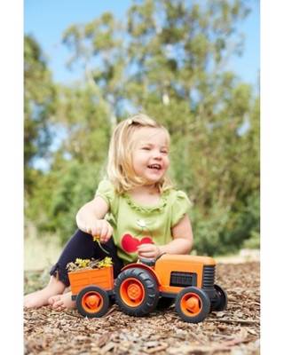 The Toy Tractor puts a whole new spin on farm-to-table. With chunky, go-anywhere tires and a detachable rear trailer, little farmers can harvest and haul the freshest organic produce their imaginations can grow. Super safe and versatile with no metal axles (no rust) or external coatings (no chipping or peeling), it's ready for any playtime payload, whether indoors or outside. No BPA, phthalates, or PVC. Classic Toys with an Eco Friendly Twist This Tractor is not your typical toy vehicle. Manufactured and assembled in the USA, it’s made from 100% post-consumer recycled plastic milk jugs. With no external coatings, paints, or dyes, this super-safe, durable toy is good for the earth and safe and fun for little ones. It’s also packaged in recycled and recyclable materials with no plastic films or twist ties, and printed with soy ink. Imaginative Play - Inside or Outside This Tractor is the perfect vehicle for teaching kids about sustainable harvesting and organic produce….and it’s also just loads of fun for playtime! The slim, rounded hood is the perfect size for little hands to grasp, and the wheels roll easily on any surface for unlimited eco friendly adventures. The detachable rear wagon hooks on easily, allowing little ones to load up and haul all sorts of cargo. Even snack time gets a fun twist when fruit, cereal, or crackers are carted to the table. And since the whole thing is dishwasher safe…cleanup is a breeze! Packaging: Reusable