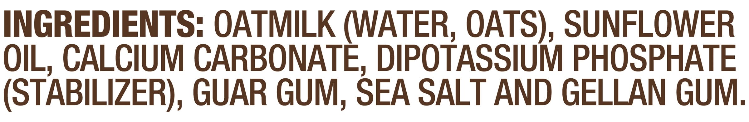Ingredients: Oatmilk (Filtered Water, Oats), Sunflower Oil, Calcium Carbonate, Dipotassium Phosphate (Stabilizer), Guar Gum, Sea Salt, and Gellan Gum. Contains: NO ALLERGENS