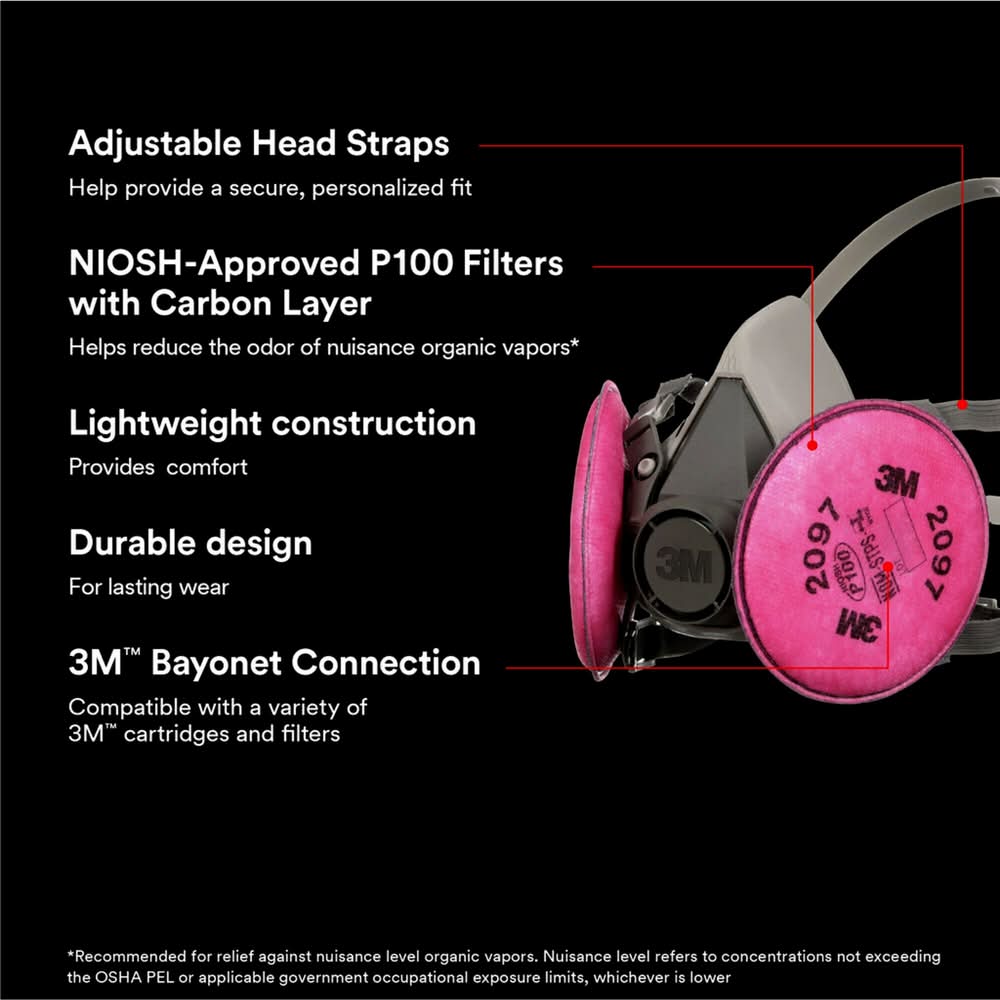 Removing lead paint and mold requires great responsibility and the appropriate respiratory protection. The 3M Odor/Particulate Reusable Respirator 6297 helps filter out airborne particles and nuisance organic vapors while you are sanding and scraping. Removing lead-based paint requires specialized respiratory protection and must be done in accordance with OSHA's Lead Standard. The NIOSH-Approved P100 filters provide at least 99.97% filtration efficiency against solids and liquid aerosols, as well as oil-based particulates. The lightweight construction and adjustable head straps help you achieve a comfortable fit. It also features a 3M Bayonet Connection, making it compatible with a wide range of 3M cartridges and filters. 3M recommended for relief against nuisance level organic vapors. Nuisance levels are less than OSHA PEL or applicable government occupational exposure limits, whichever is lower.