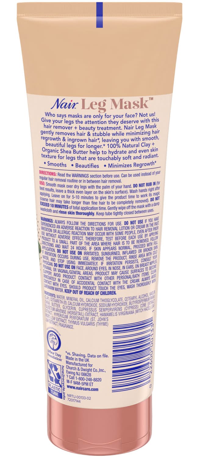 We love your face, but don’t let it have all the fun. Nair™ Leg Masks™ give you the pampering of a face mask plus the leg hair removal you expect from Nair™. This super special formula with 100% natural clay and organic shea butter deeply hydrates your skin for a smooth, more even finish. It also exfoliates and removes hair at the same time, leaving you with soft, stubble-free legs that last longer than shaving. Perfect for: Legs and feet. Not for use on face. All skin types. Normal to coarse hair. Removes hair and stubble Our iconic hair removal formula dissolves hair below the skin’s surface, banishing stubble, minimizing regrowth and keeping you smooth for longer. Hydrates and smoothes skin With organic shea butter and 100% natural clay, our formula helps hydrate and even your skin texture while clearing away dead skin cells. Dermatologist tested Trust the experts. Not only has Nair™ been the go-to hair removal brand for over 80 years, we also pass all our products by skincare professionals. • Church & Dwight Co., Inc., • Packaging: Reusable